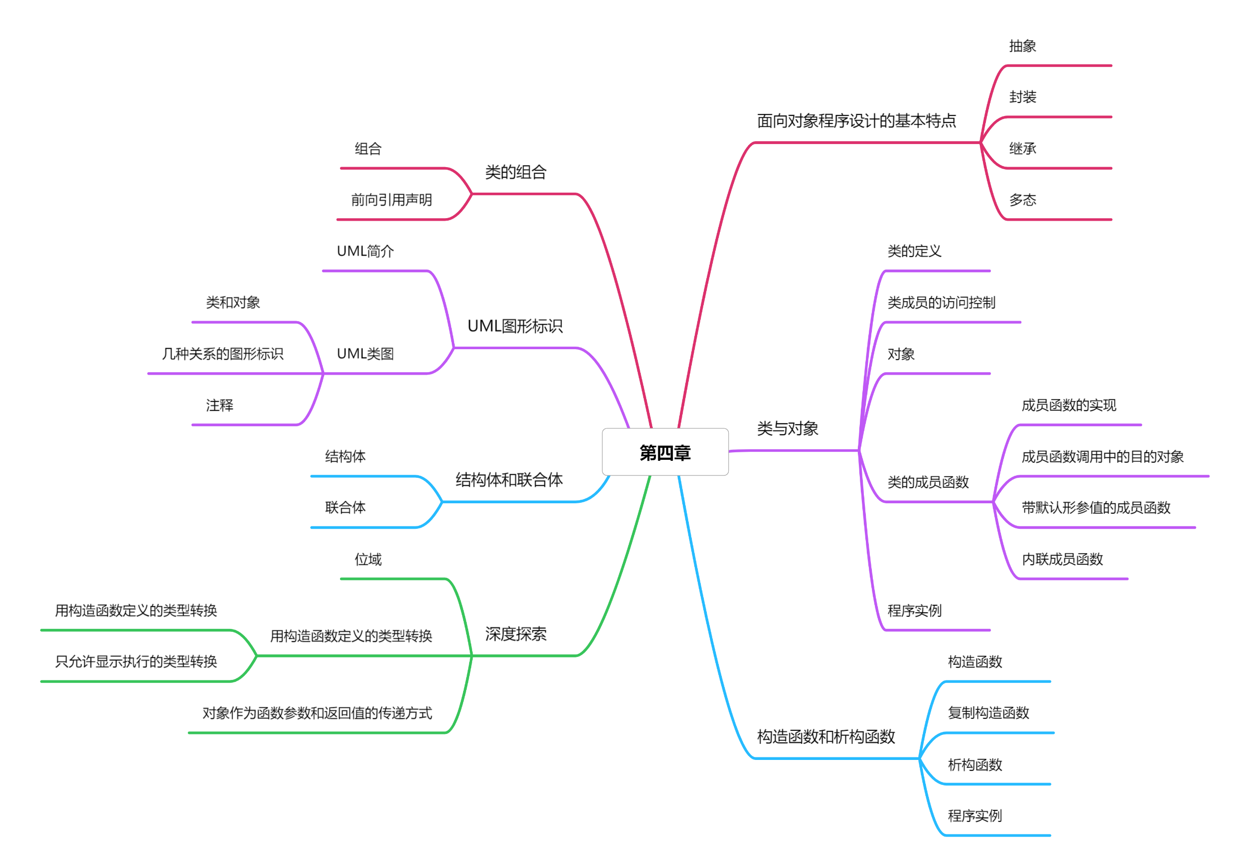 前言:目前已复习第一章第二章第三章第六章为c艹基于c语言升华的内容,今天我们进入c艹中一大重要板块第四章 类与对象的学习,同时以读书笔记与体会、作业五 类与对象及实验一的形式分享。对象是有形的也可以是无形的,我的理解int,float,bool都是一种特殊的类,可进行本身属性的操作和关系运算,定义一个类相当于赋予该类的变量一种“特性”,对象就是存储“类”类型的变量。今日学习 第四章 类与对象 参考于清华大学出版社郑莉老师的《C++语言程序设计》第五版,以下为自制思维导图: