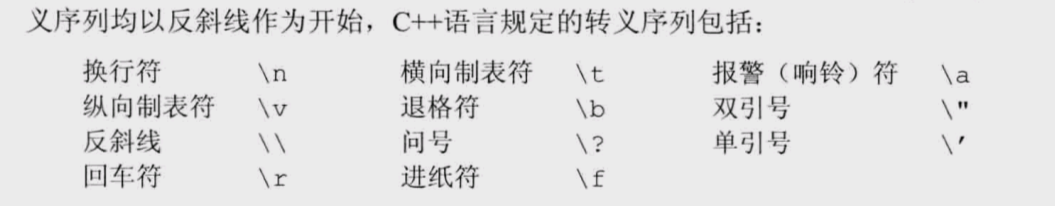 - 转义序列:当遇到不可打印的字符,如退格或者其他控制字符(因为他们没有可视字符),或者在c++中有特殊含义的字符(单引号,双引号,问号,反斜线),这些情况下都要用到转义序列。(转义序列均以反斜线作为开始)。