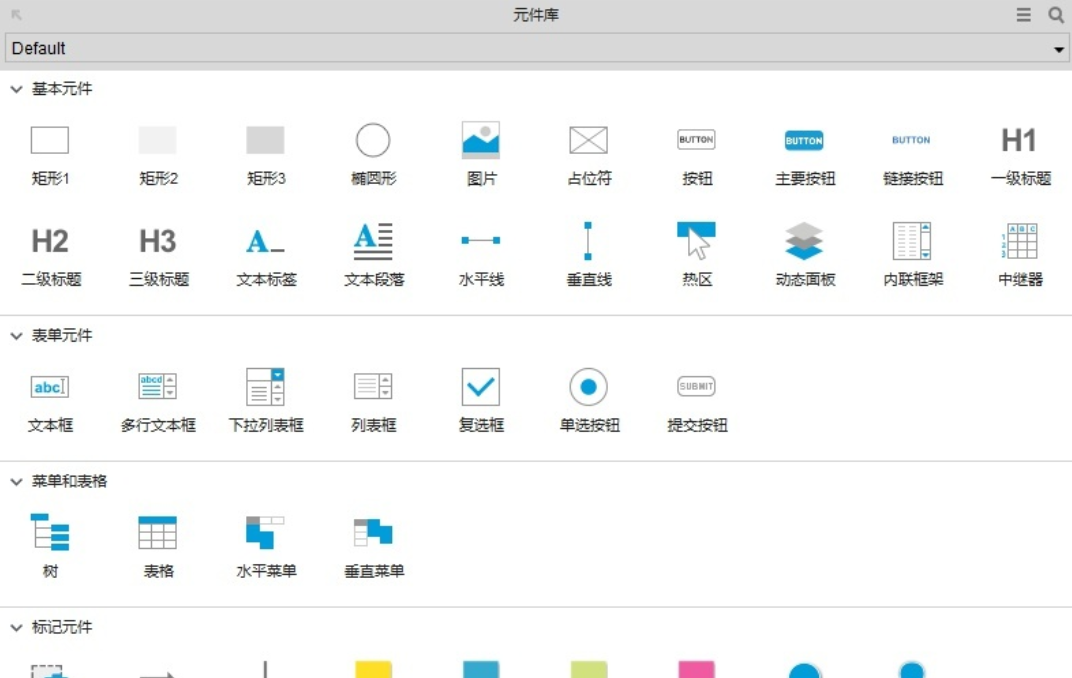 其次是元件的使用,需要说明的是,AXURE的元件库不光可以载入已有的部件库(*.rplib文件),创建自己的部件库。甚至还可以对系统自带的默认元件库进行修改,删除。你可以把一些自己不用的元件都去掉,打造一套完全符合自己使用习惯的元件库。AXURE的所有元件分为三大类型:即默认(default)、流程图(flow)、图标(icon),使用最多的主要是默认元件。