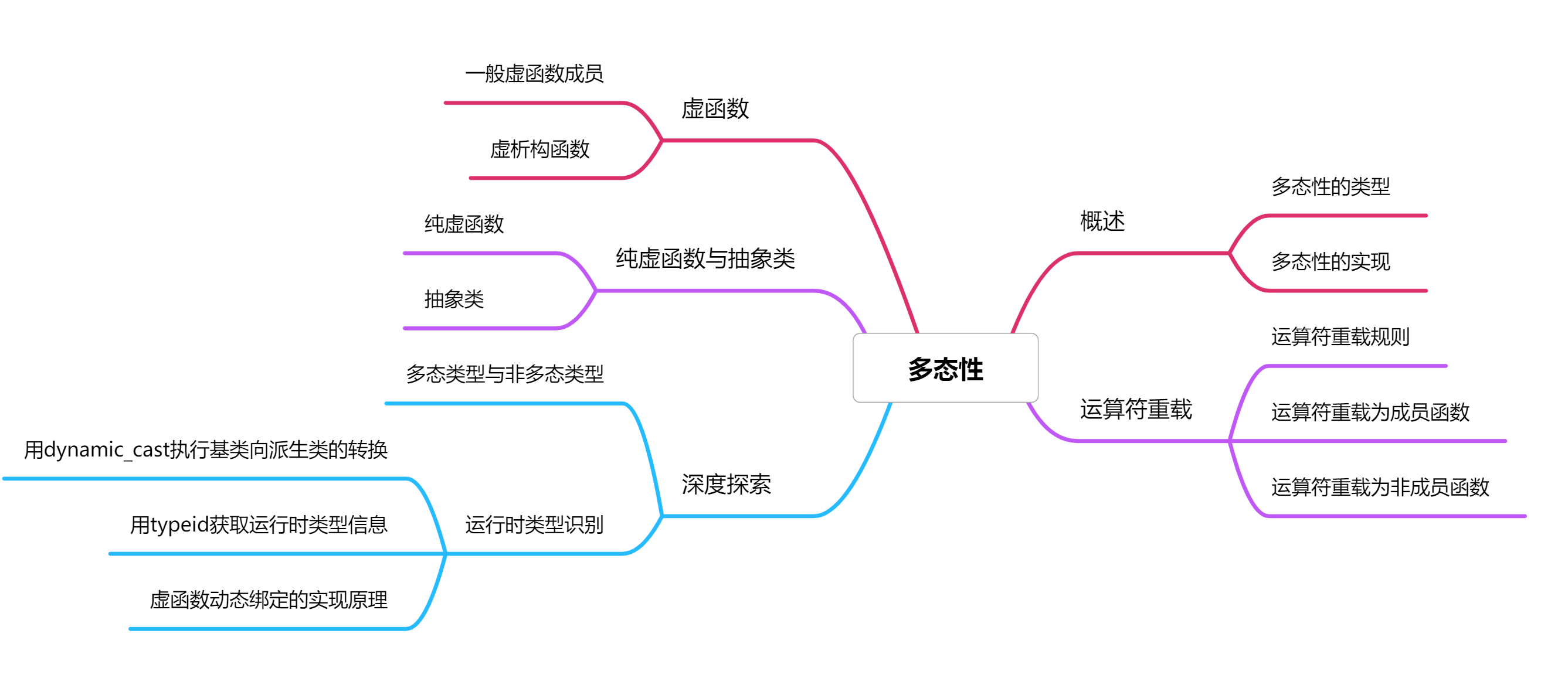 总结:运算符重载是对已有的运算符赋予多重含义,使用已有运算符对用户自定义类型进行操作,虚函数使得同一个函数在不同的类中具有不同的实现,从而实现多态性和代码重用,代码灵活性更高,程序扩展性更强。