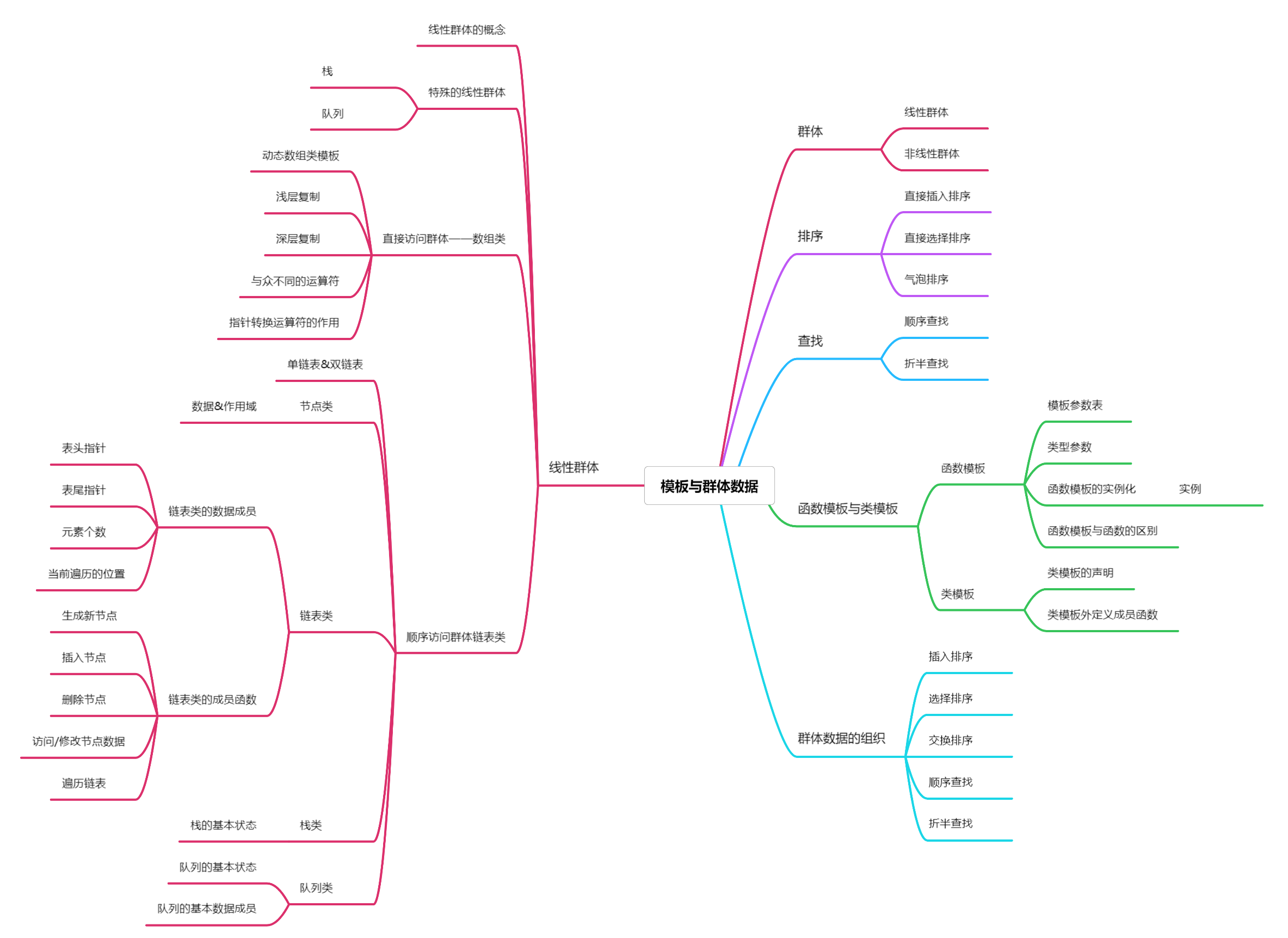 前言:最近的两次测验一共94分,所说带有点小技巧但结果是好的,接下来学习第九章的知识 模板与群体数据。课本知识参考于清华大学出版社郑莉老师的《C++语言程序设计》第五版,以下为自制思维导图: