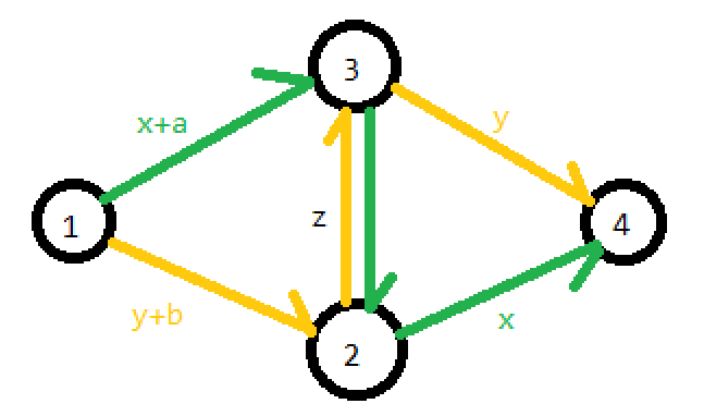 这样一来就可以得到 \(dijkstra\) 后形成的 DAG 了。但是这个 DAG 并不是我们最终想要的最短路集,因此考虑将所有的边反向后对该图进行一次 dfs,标记所有遍历到的边,这样便得到了最短路集。