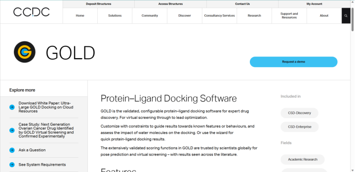 GOLD是为蛋白质配体自动对接开发的第一个软件。这个网站探索了配体的完全灵活性和接近其活性位点的蛋白质部分。它使用遗传算法将配体与蛋白质结合位点匹配,修改其位置、方向和构象。近几年,GOLD进行了很多改进,其中之一就是积分函数,它现在由四个配体能量参数组成:内外范德华、外氢键和内扭转,也可加入另一种组分,即内部氢键。其优点:靠近蛋白质活性部位的部分柔韧性、经常改进、内部氢键作为参数。缺点:仅支持蛋白质配体对接、网站:https://www.ccdc.cam.ac.uk/solutions/csd-discovery/Components/Gold/