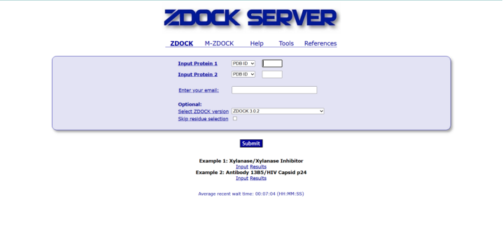 ZDOCK服务器是一个对用户十分友好的用于蛋白质-蛋白质对接的网络平台,允许编辑评分参数的功能和显示输入输出可视化的功能。该过程分为三个步骤:(1)输入,可以从结构或PDB id的上传进行;(2)选择接触或堵塞残留物;(3)用JMol可视化计算和结果。然而,该平台允许用户下载结果并在其他分析软件中使用它们,ZDOCK的运行时间大约为11.5分钟。它的不足主要在于没有聚类、不包括后处理分析。