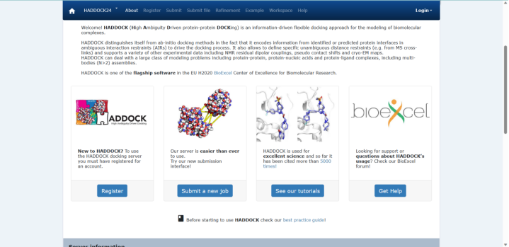HADDOCK是一个开放的网络服务器。用户可以进行蛋白质-蛋白质和蛋白-配体对接,可以使用多种分子作为输入,包括环肽和聚糖。该平台允许用两个分子到20个分子进行对接计算。它有许多界面,从Easy层到Guru层,允许不同级别的用户控制模拟参数。Easy层是最基本的,这解释了它的局限性。用户可以上传两个结构,定义活动残基和非活动残基,并通过应用默认参数提交平台进行对接计算。Guru层可以获得完全的访问和控制,用户可以修改500多个参数。其缺点主要是新用户的控制受限。