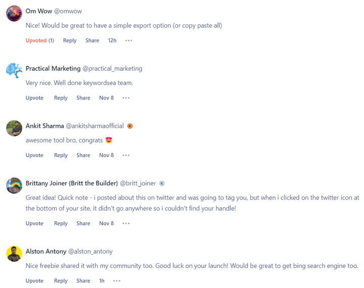 用户反馈: 出乎我意料之外,竟然还不错。甚至有点像水军的评论。 有人还说,想发条twitter帮我宣传同时圈我,但是没找到我的twitter账号 (当然没有啊,这是mvp,哈哈哈)。见下图。