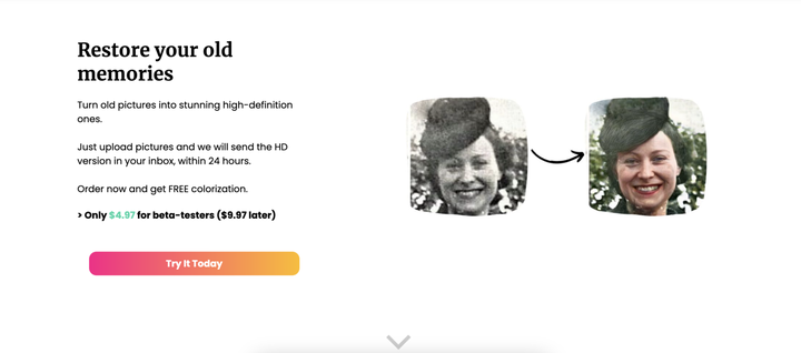 他的思路,和我们上面讨论的内容,如出一辙。而他的产品功能,是生财有术很多人都熟悉的——老照片上色。