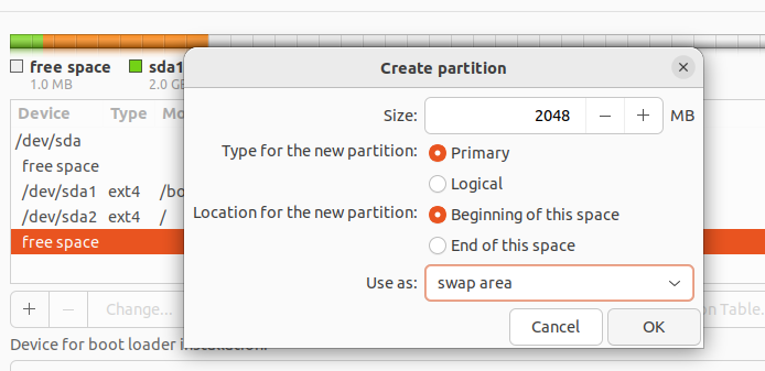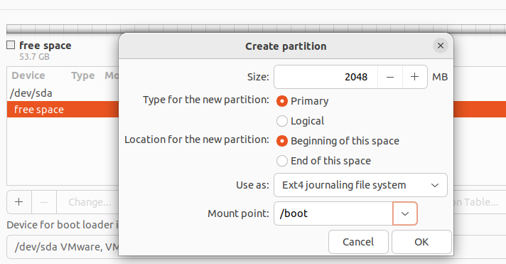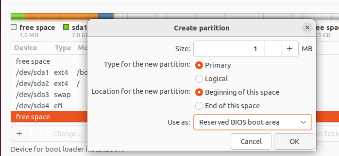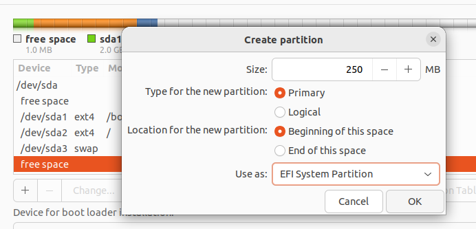 创建EFI 分区(100~250 MB),bios 引导区(≥1MB ),(如果使用 GPT 磁盘)