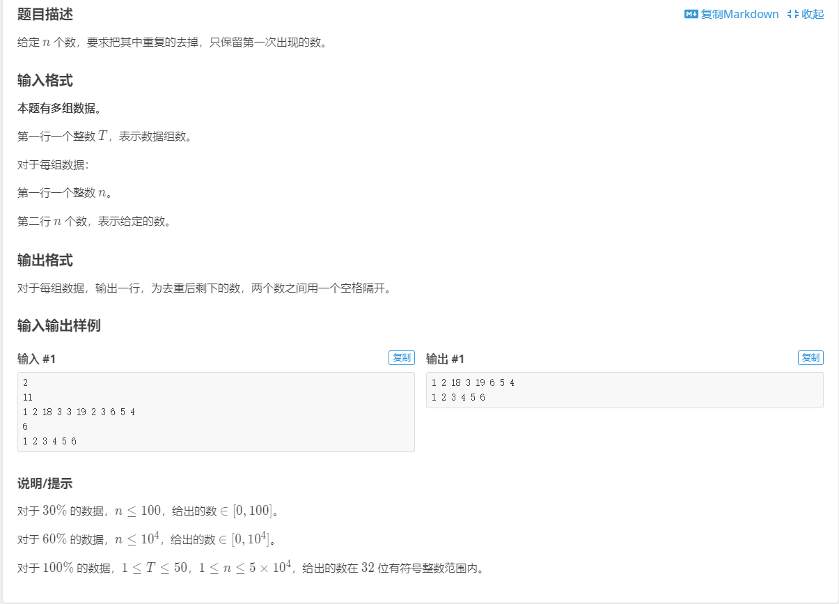 auto it=hashtable.find(x);//关键在这,hashtable.find()的时间复杂度为O(1); if( it==hashtable.end() ){ cout<<x<<' '; hashtable[x]=0; } } cout<<'\n'; } int main() { Iopause; int t; cin>>t; while(t--){ Solve(); } return 0; }