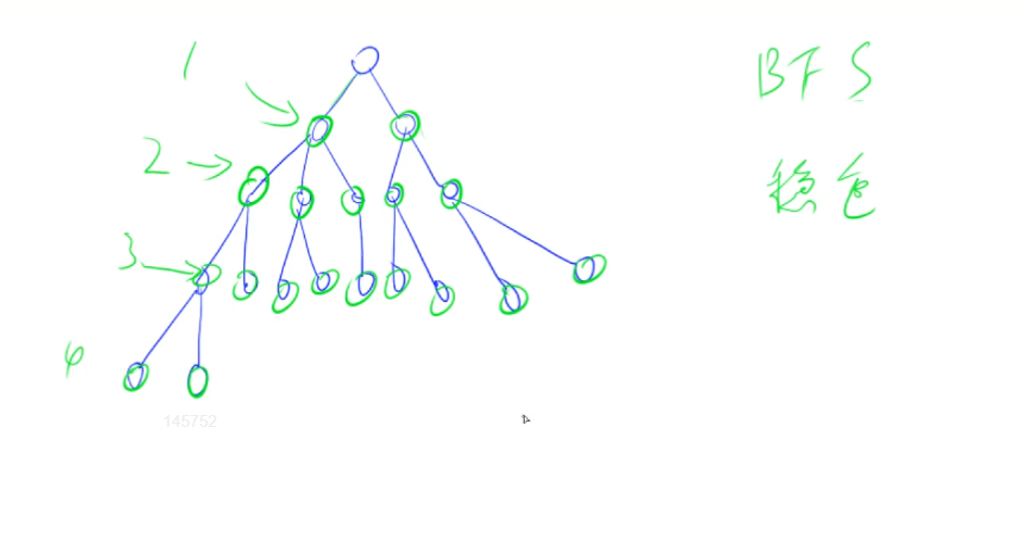 搜索顺序:搜索所有到起点距离为1的点 - > 搜索所有到起点距离为2的点 - > 搜索所有到起点距离为3的点 - > ……(距离为n的点是由距离为n-1的点走到的,而且之前没有走过)