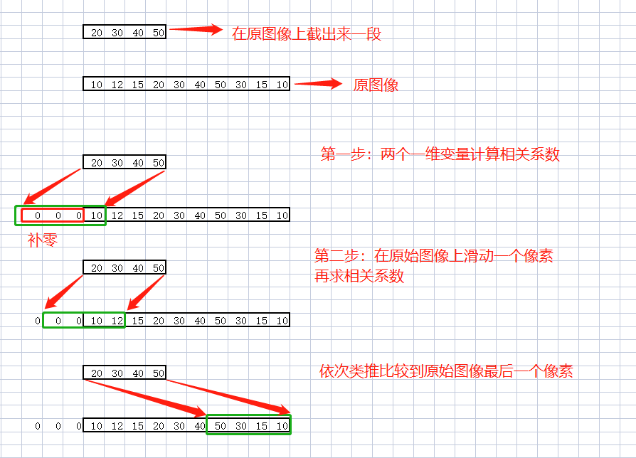 原始图像[ 10 12 15 20 30 40 50 30 15 10] 总共10个长度的像素,裁剪图像[ 20 30 40 50]总共4个长度的像素,在原始图像前补4 -1 个0,让裁剪图像依次从左到右得到 10 +4 -1 个长度的系数向量。在这个系数向量中找到最大的系数