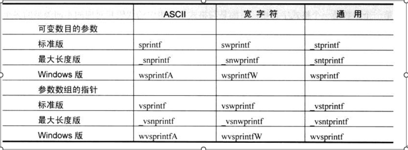 当然了这些函数都是有Windows版本的,windows的通用版本是:wsprintf,ASCII版是wsprintfA,宽字符版是:wsprintfW