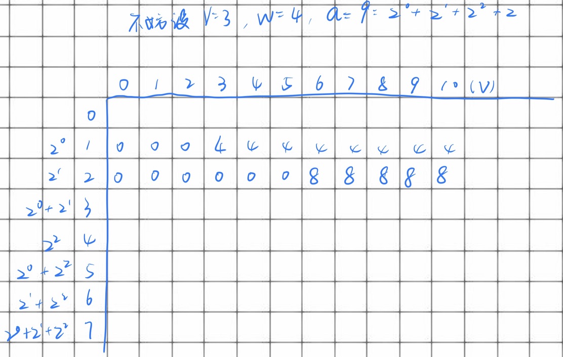 可以看到如果当取3给为最优时,我们可以取a[0]和a[1],因为2进制可以表示所有10进制的数,所以无论最优应该取几,都能由a拆分的数组组合而成,类似于01背包的操作。
