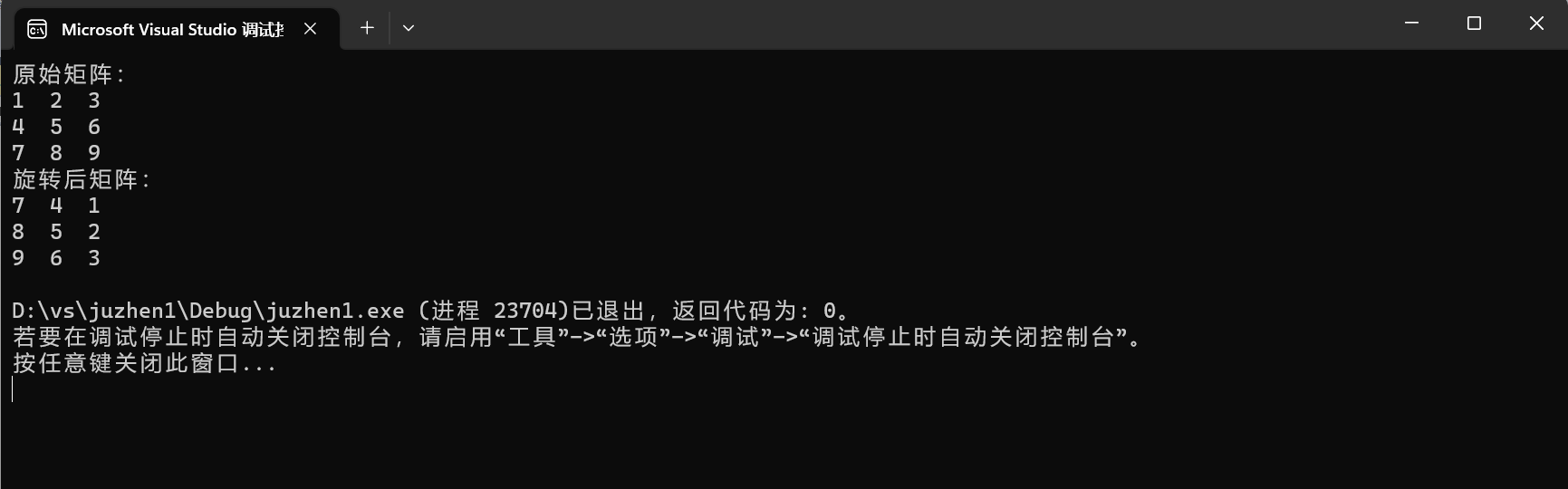 3、使用一个主函数,调用transposeMatrix和generatedMatrix这两个函数,输出原始矩阵和旋转后的矩阵。