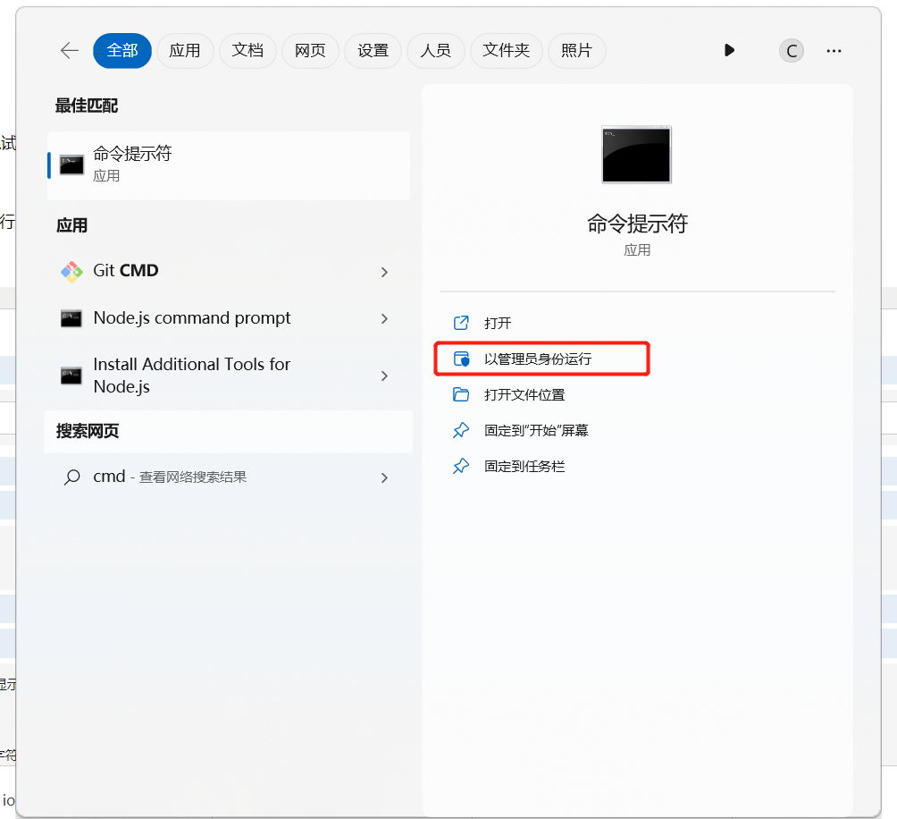 接下来在电脑搜索栏输入“cmd”,已管理员身份运行命令行