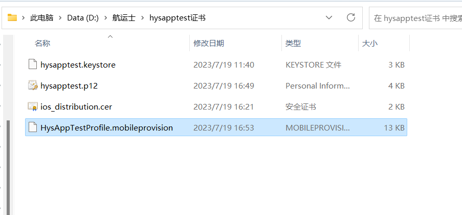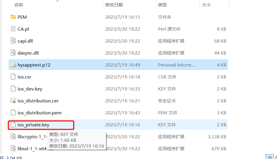 到此文件都已经生成完毕,我们可以新建一个单独的文件夹,用于存放该应用的证书以及密钥,方便管理