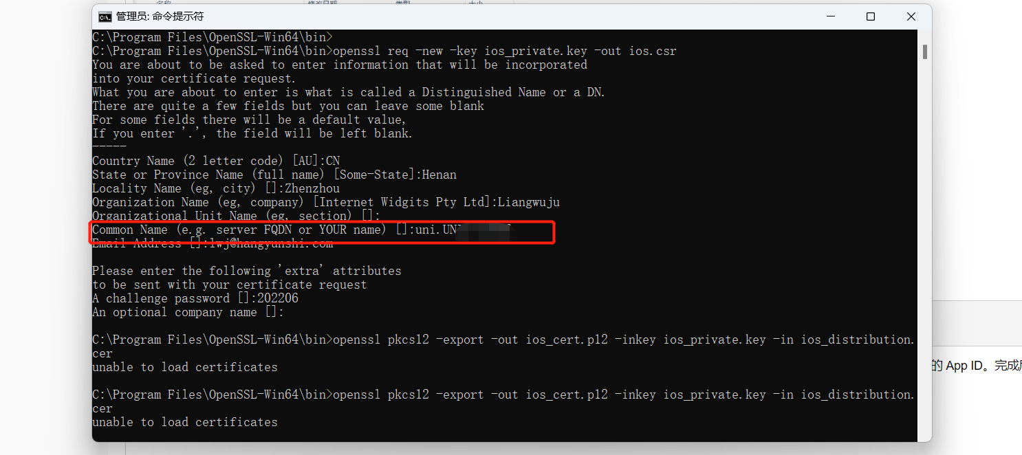 运行该命令后,您需要提供一些信息,如国家、省份、城市、组织等。最重要的是 Common Name(通用名称),这里应该输入与您的开发者账号关联的 App ID。完成后,将生成 ios.csr 文件。这里需要注意,Common Name这里需要输入和你的屏柜开发者账号关联的App ID,也就是你要打包的这个应用的App ID