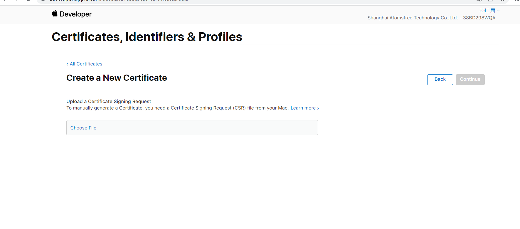 按照步骤上传您生成的 CSR 文件并申请开发者证书。