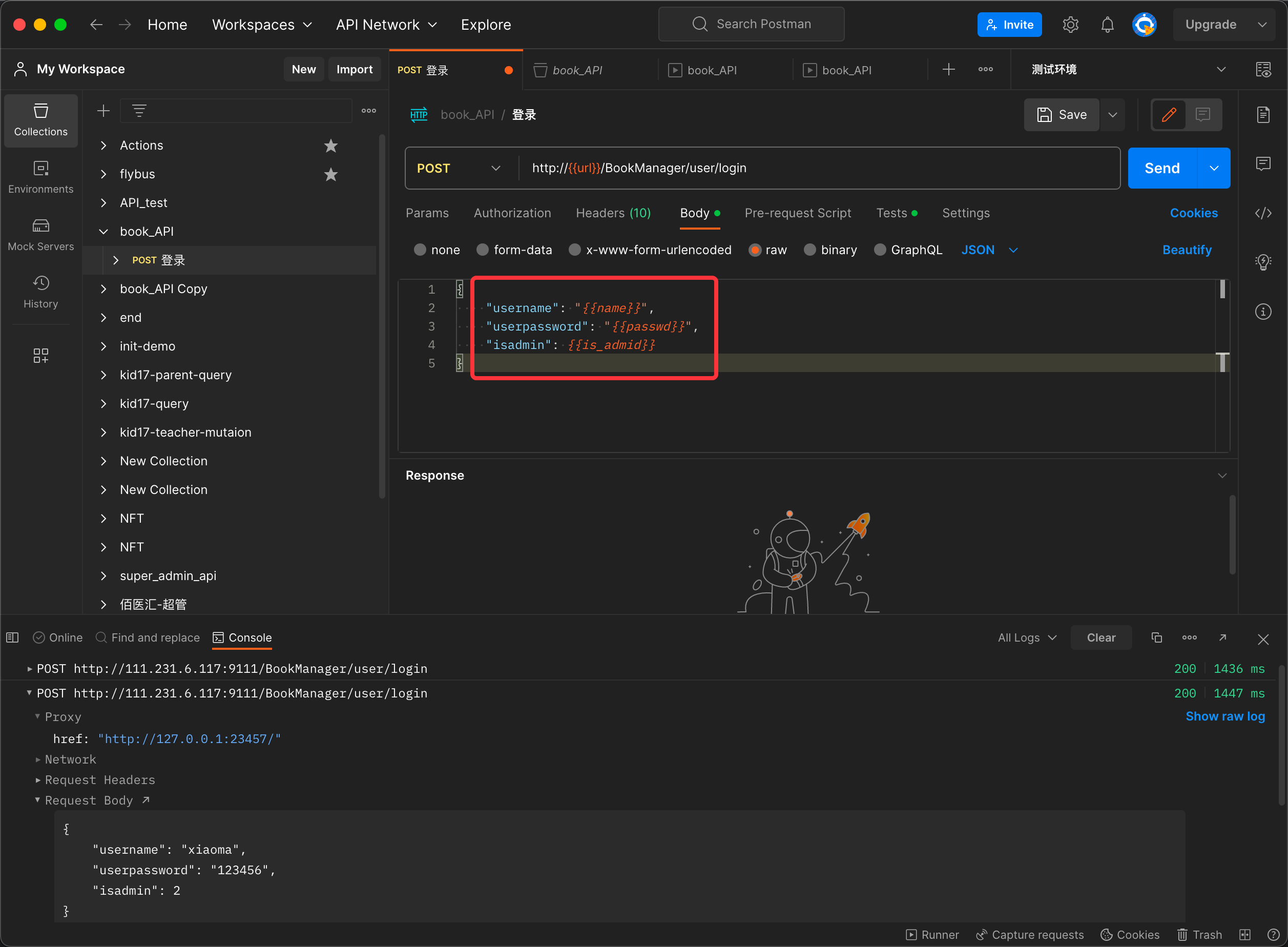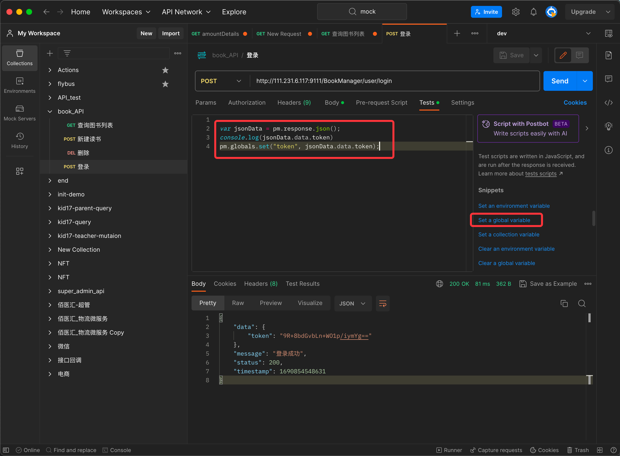 //获取json响应数据 var jsonData = pm.response.json(); //控制台打印响应数据中的部分字段 console.log(jsonData.data.token) 设置全局变量 pm.globals.set("token", jsonData.data.token);