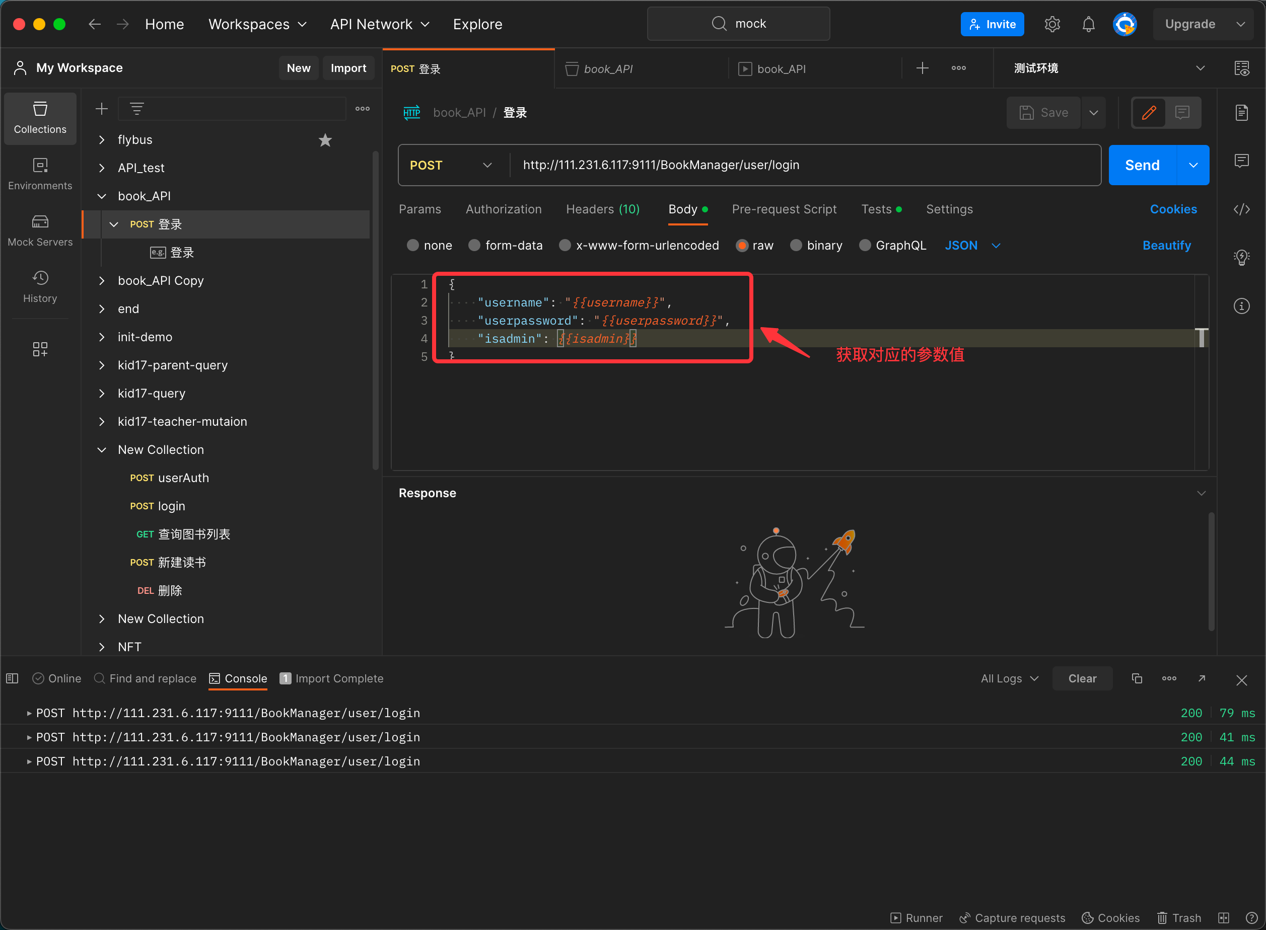 //定义一个变量接收token的值 var get_token = pm.variables.get("token") //打印token的值 console.log(get_token)