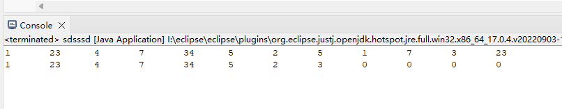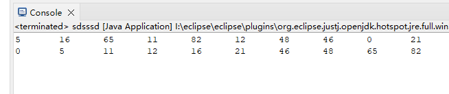 package dsv;import java.util.Scanner; public class sdsssd { public static void main(String[] args) { int a[]= {1,6,2,3,9,4,5,7,8}; for(int i = 1;i<a.length;i++) { for(int j = i-1;j>=0;j-- ) { if(a[j+1]<a[j]) { int t = a[j]; a[j] = a[j+1]; a[j+1] = t; } else { break; } } } for(int i =0; i<a.length;i++) { System.out.print(a[i]); } }}