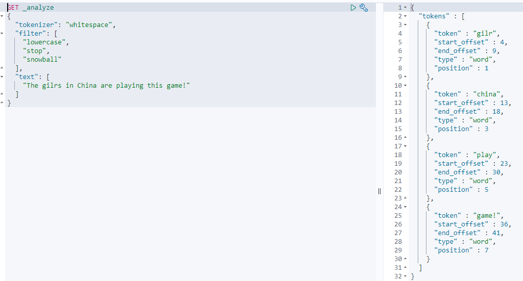 token_chars :描述在生成的字符中怎样的字符是合法的。标点和特殊字符都会被从字符流中除掉,但在例子中故意保留了下来;也保留了空格, 因此只要文中包含了United Status,那么当用户搜索us时,United Status就会出现在搜索列表中。
