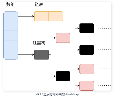 JDK1.8 之前 HashMap 由 数组+链表 组成的,数组是 HashMap 的主体,链表则是主要为了解决哈希冲突而存在的(“拉链法”解决冲突)。 JDK1.8 以后的 HashMap 在解决哈希冲突时有了较大的变化,当链表长度大于等于阈值(默认为 8)(将链表转换成红黑树前会判断,如果当前数组的长度小于 64,那么会选择先进行数组扩容,而不是转换为红黑树)时,将链表转化为红黑树,以减少搜索时间。