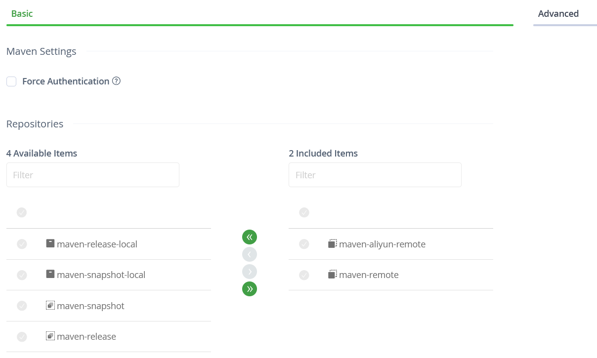 (6) Include and Exclude Patterns: 包含模式匹配和排除模式匹配用于制品的搜索和定位,如果一个仓库定义了Include Patterns,那么其匹配的制品搜索会被定位到该仓库中进行查找;反之,如果一个仓库定义了Exclude Pattern,其匹配的制品搜索会绕过该仓库。