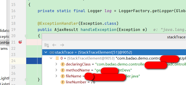 import com.badao.demo.common.AjaxResult; import com.badao.demo.constant.Constants; import com.badao.demo.constant.HttpStatus; import org.slf4j.Logger; import org.slf4j.LoggerFactory; //注意引入包的路径 import org.springframework.validation.BindException; import org.springframework.web.bind.MethodArgumentNotValidException; import org.springframework.web.bind.annotation.ExceptionHandler; import org.springframework.web.bind.annotation.RestControllerAdvice; @RestControllerAdvice public class GlobalExceptionHandler { private static final Logger log = LoggerFactory.getLogger(GlobalExceptionHandler.class); @ExceptionHandler(Exception.class) public AjaxResult handleException(Exception e) { StackTraceElement stackTrace = e.getStackTrace()[0]; String methodName = stackTrace.getMethodName(); String fileName = stackTrace.getFileName(); String className = stackTrace.getClassName(); int lineNumber = stackTrace.getLineNumber(); log.error("异常发生在文件{}的类{}中的方法{}的第{}行',异常信息:{}", fileName,className,methodName,lineNumber,e.getMessage()); return AjaxResult.error(HttpStatus.ERROR, Constants.SERVER_ERROR); } }