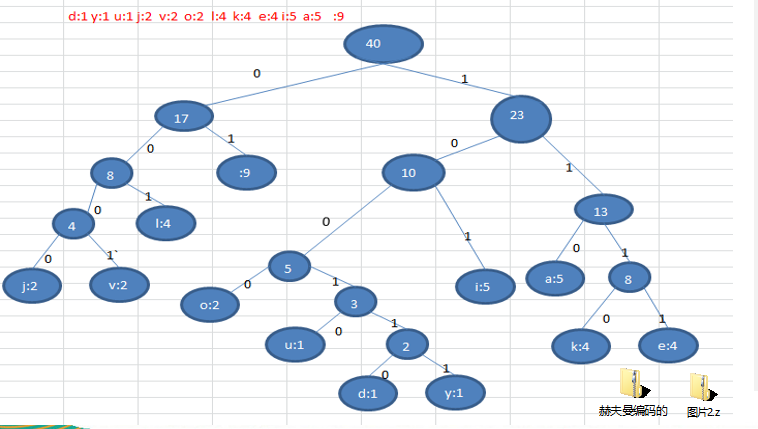 0= , 1=a, 10=i, 11=e, 100=k, 101=l, 110=o, 111=v, 1000=j, 1001=u, 1010=y, 1011=d 说明:按照各个字符出现的次数进行编码,原则是出现次数越多的,则编码越小,比如 空格出现了9 次, 编码为0 ,其它依次类推.