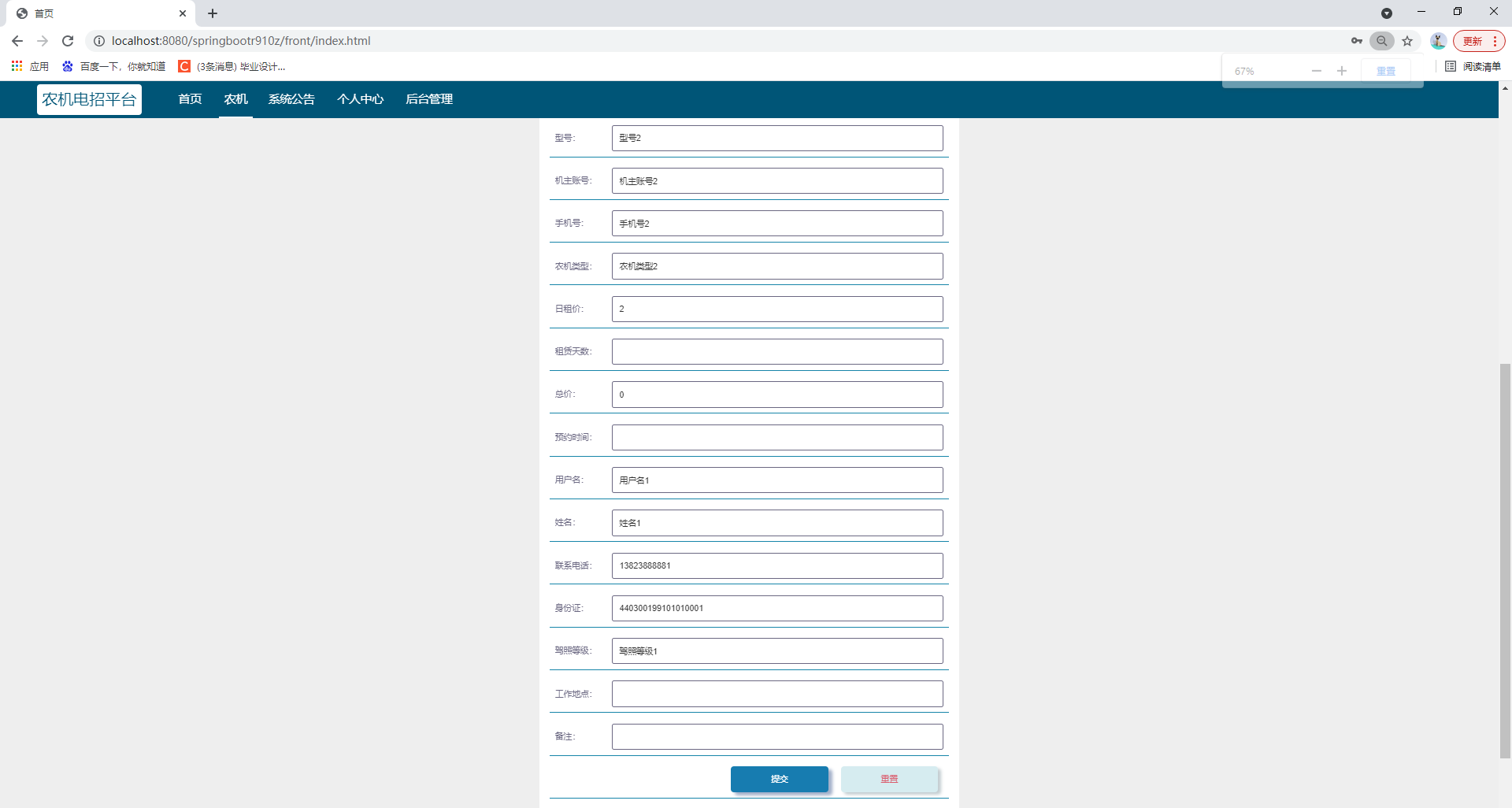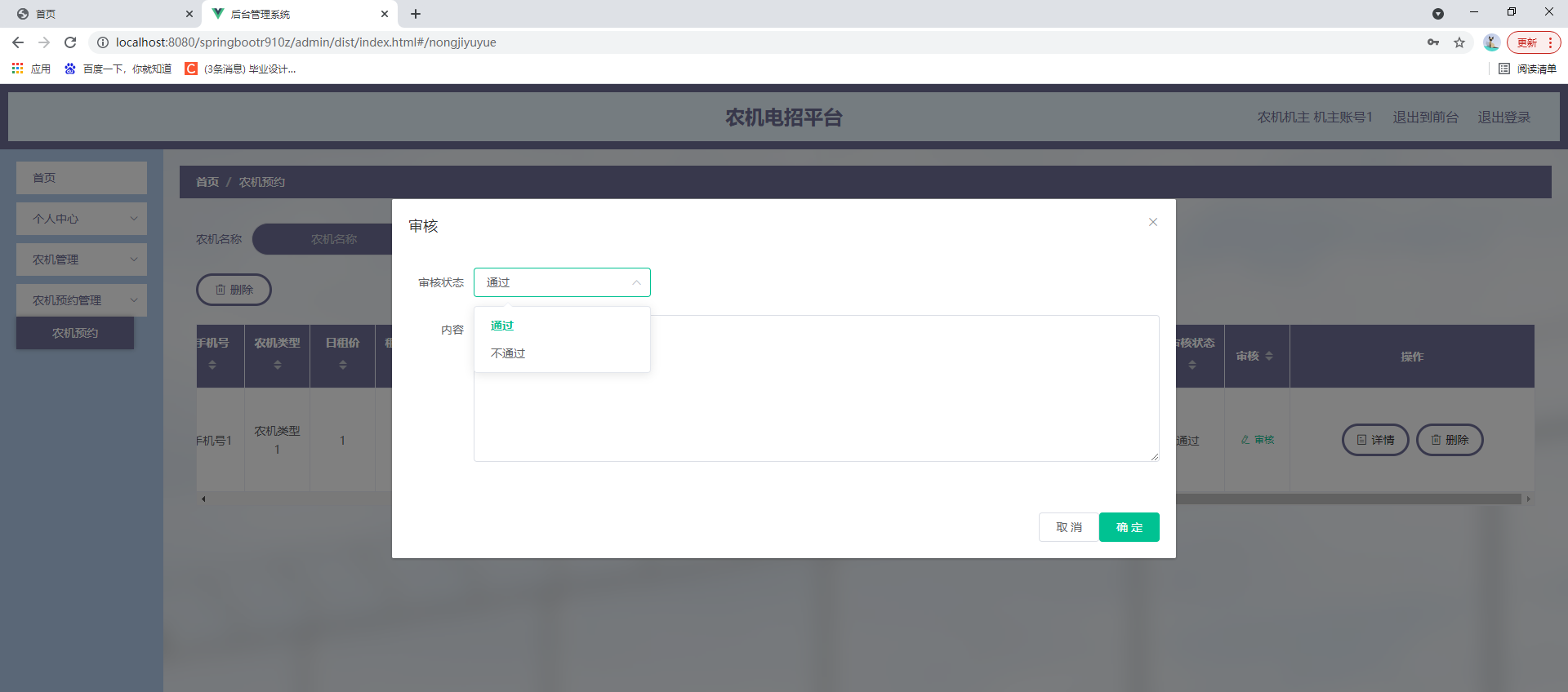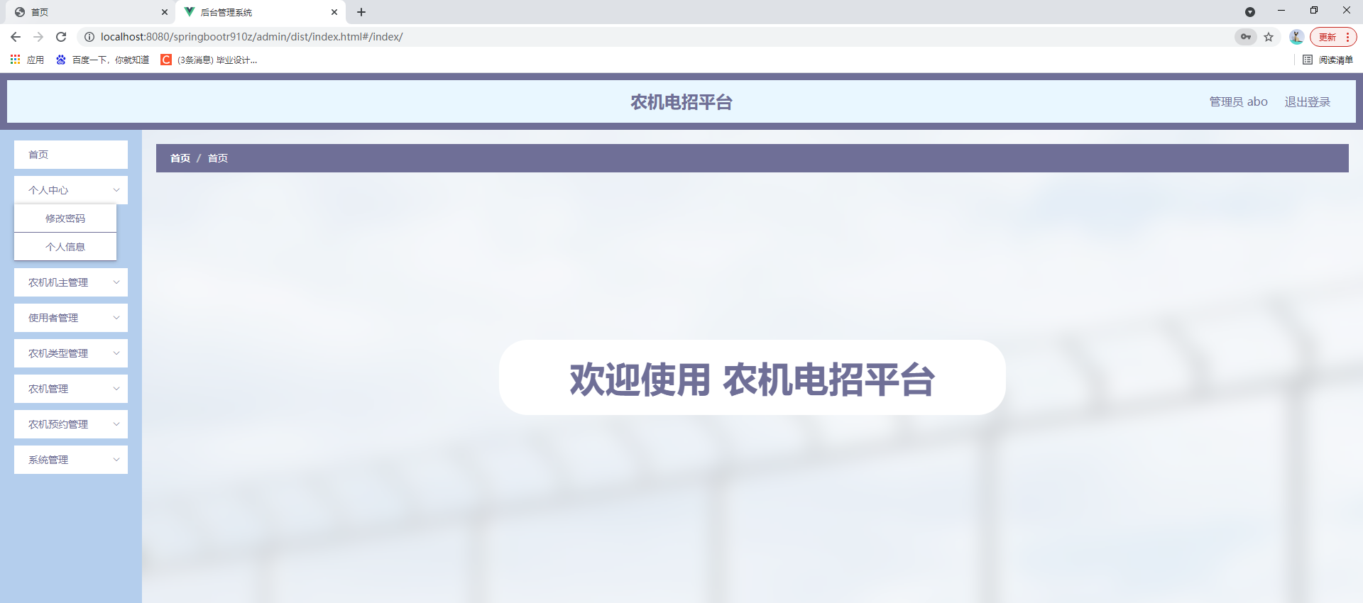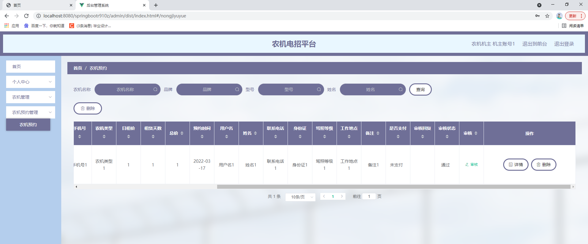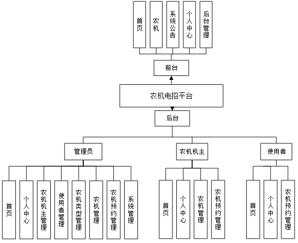 该系统包括前台操作和后台管理两个部分,一方面,为用户提供首页,农机,系统公告,个人中心,后台管理等功能;另一方面,为管理员提供首页,个人中心,农机机主管理,使用者管理,农机类型管理,农机管理,农机预约管理,系统管理等功能。