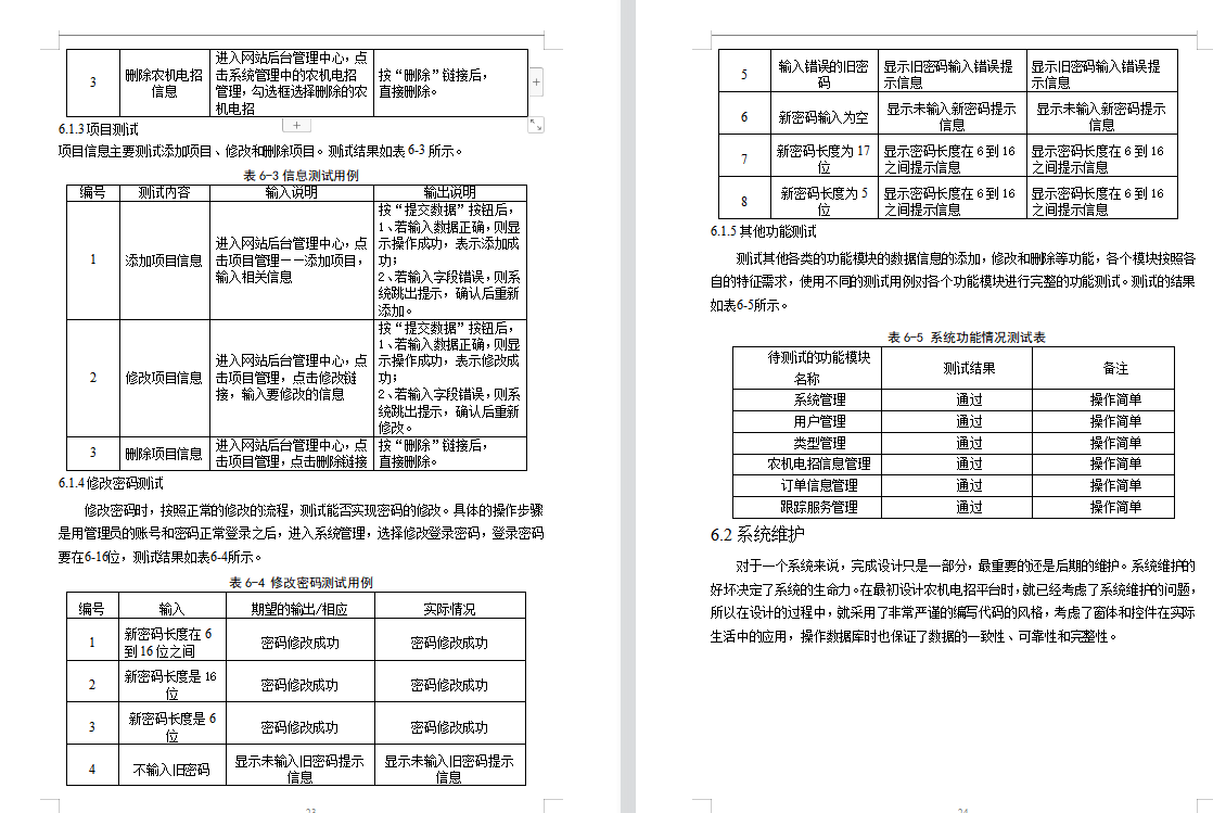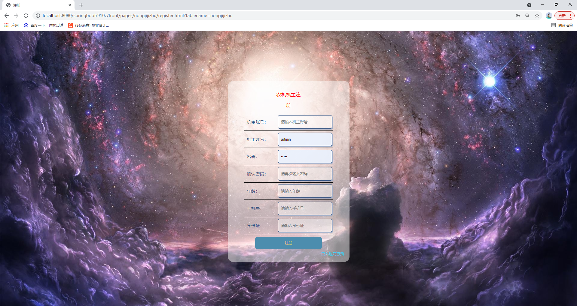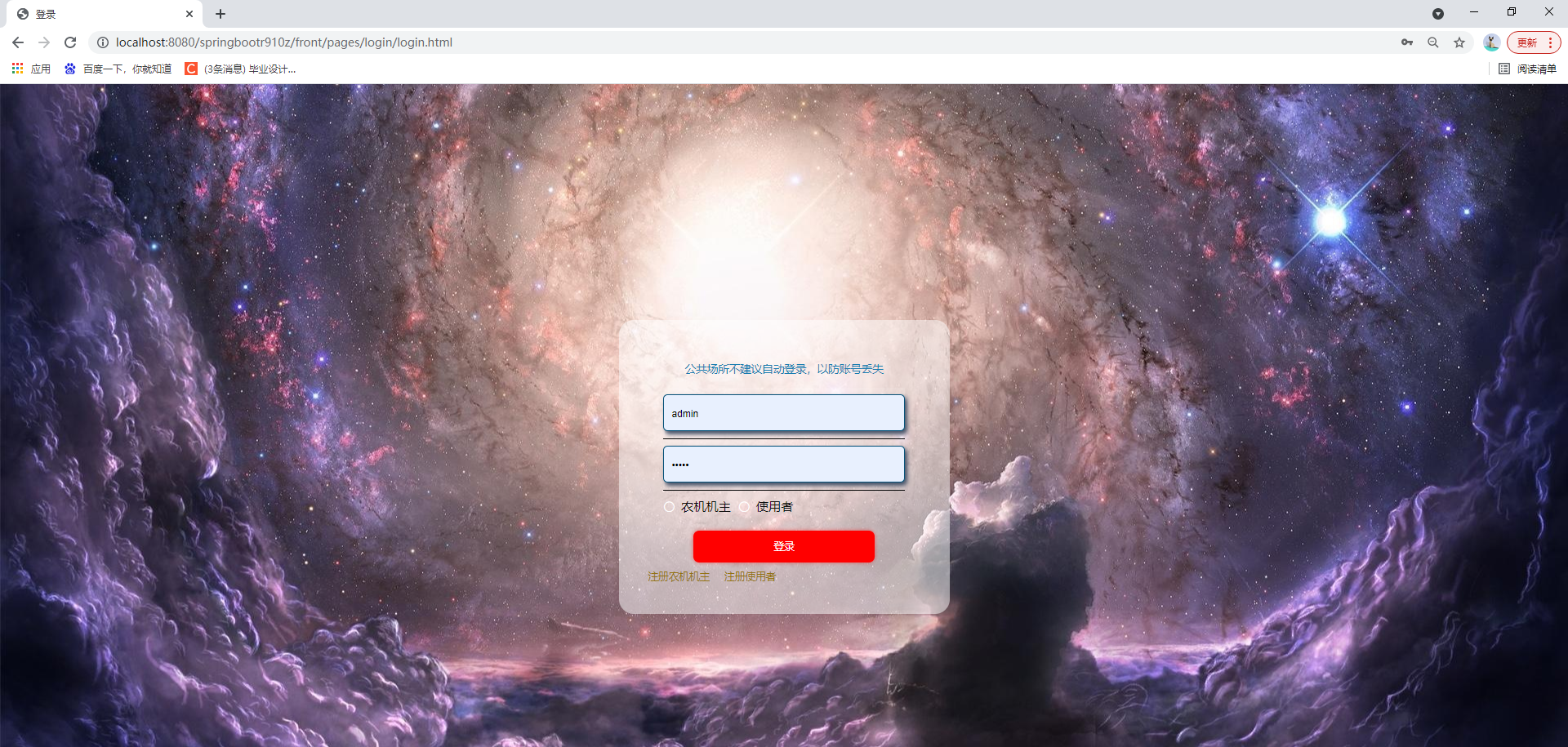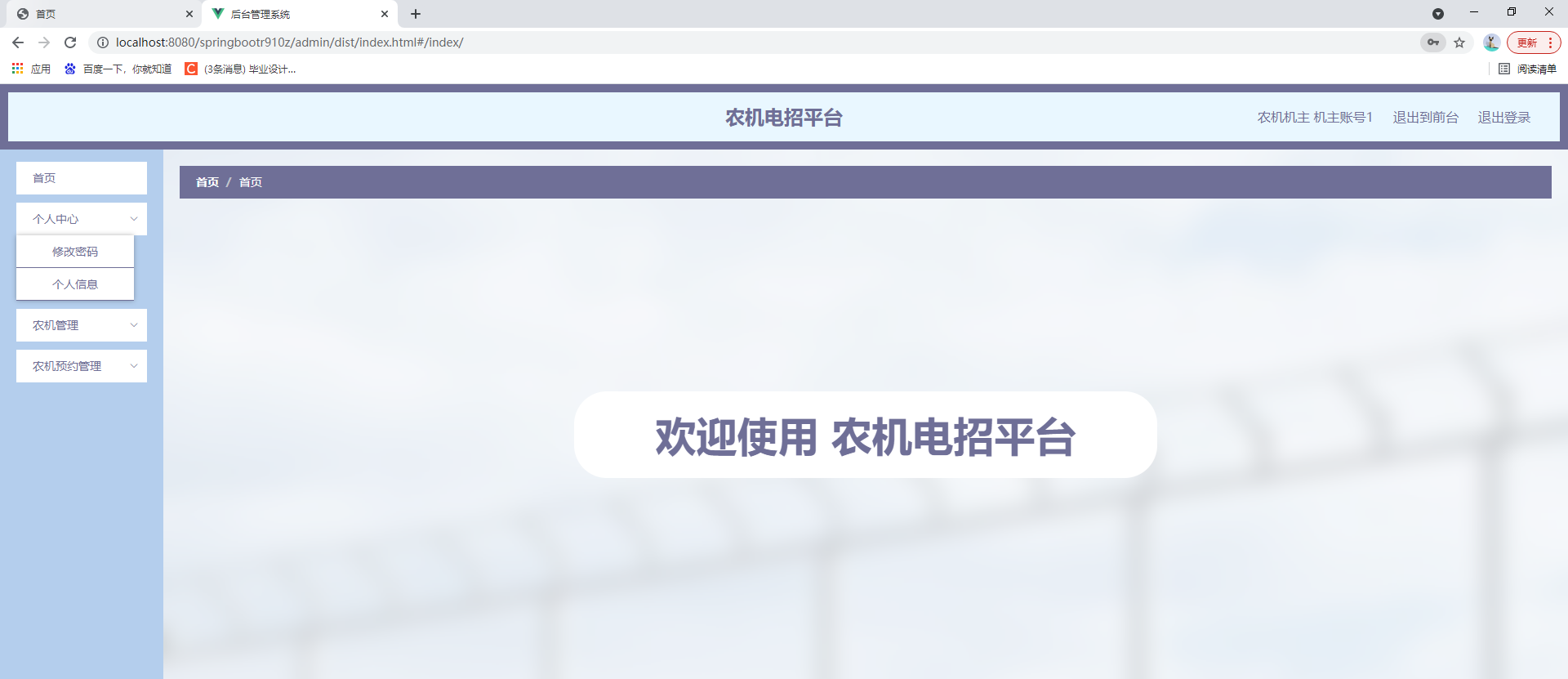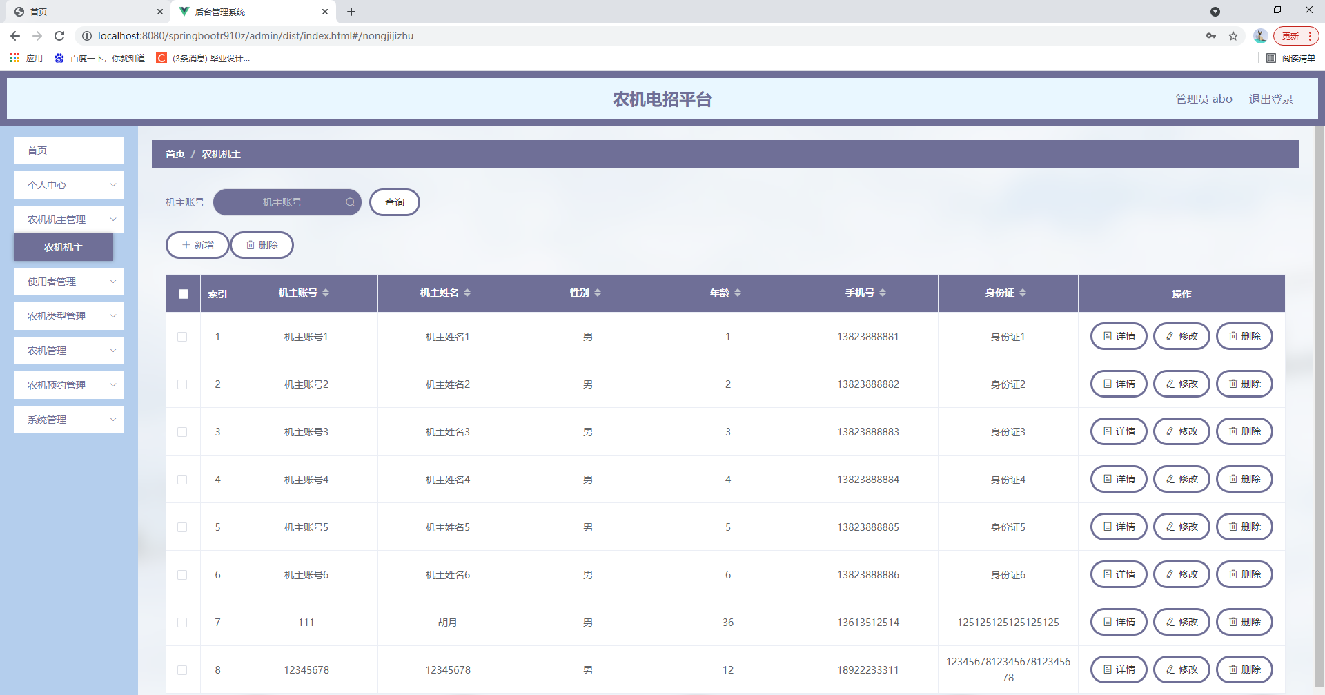 该系统包括前台操作和后台管理两个部分,一方面,为用户提供首页,农机,系统公告,个人中心,后台管理等功能;另一方面,为管理员提供首页,个人中心,农机机主管理,使用者管理,农机类型管理,农机管理,农机预约管理,系统管理等功能。