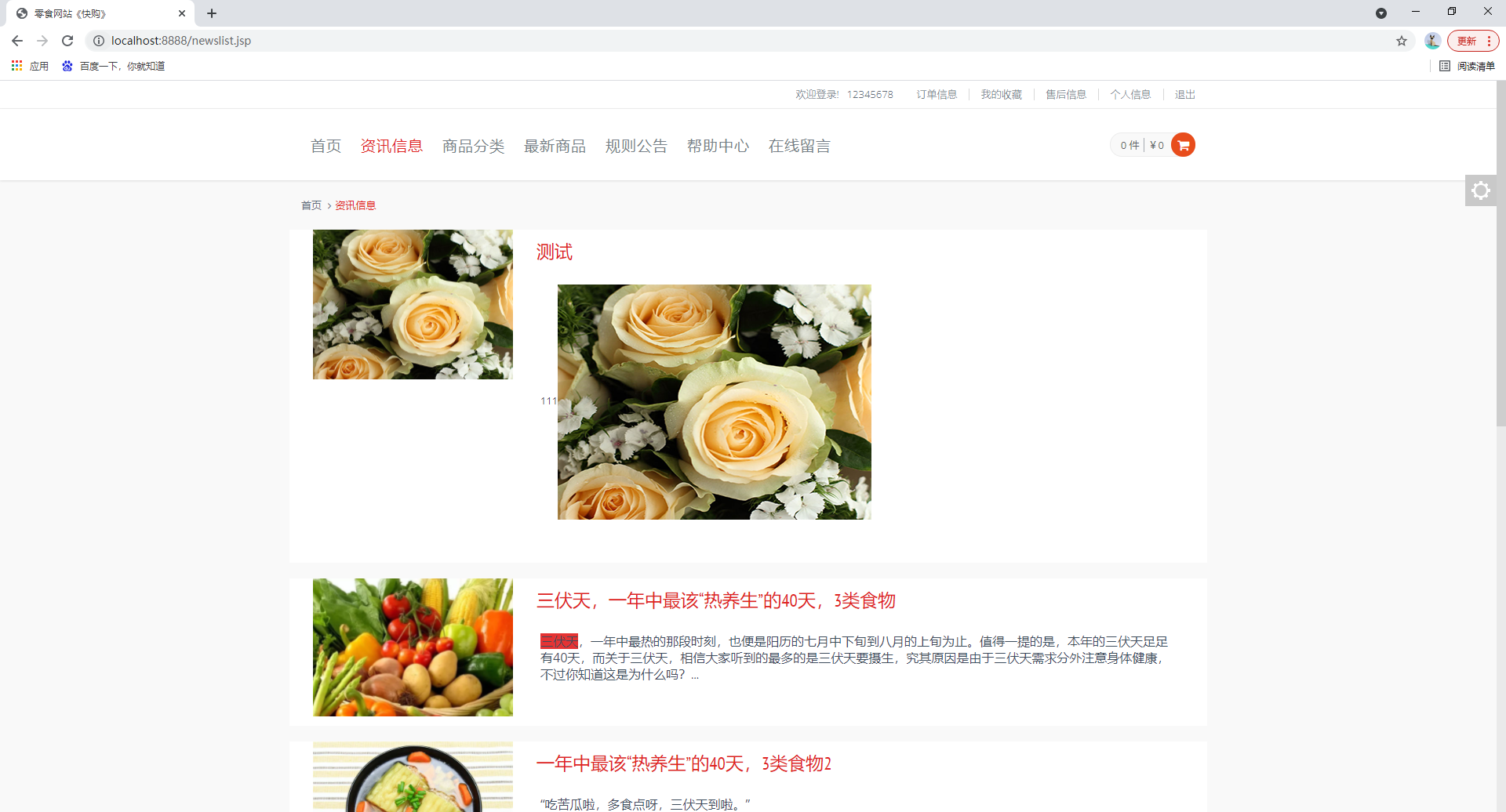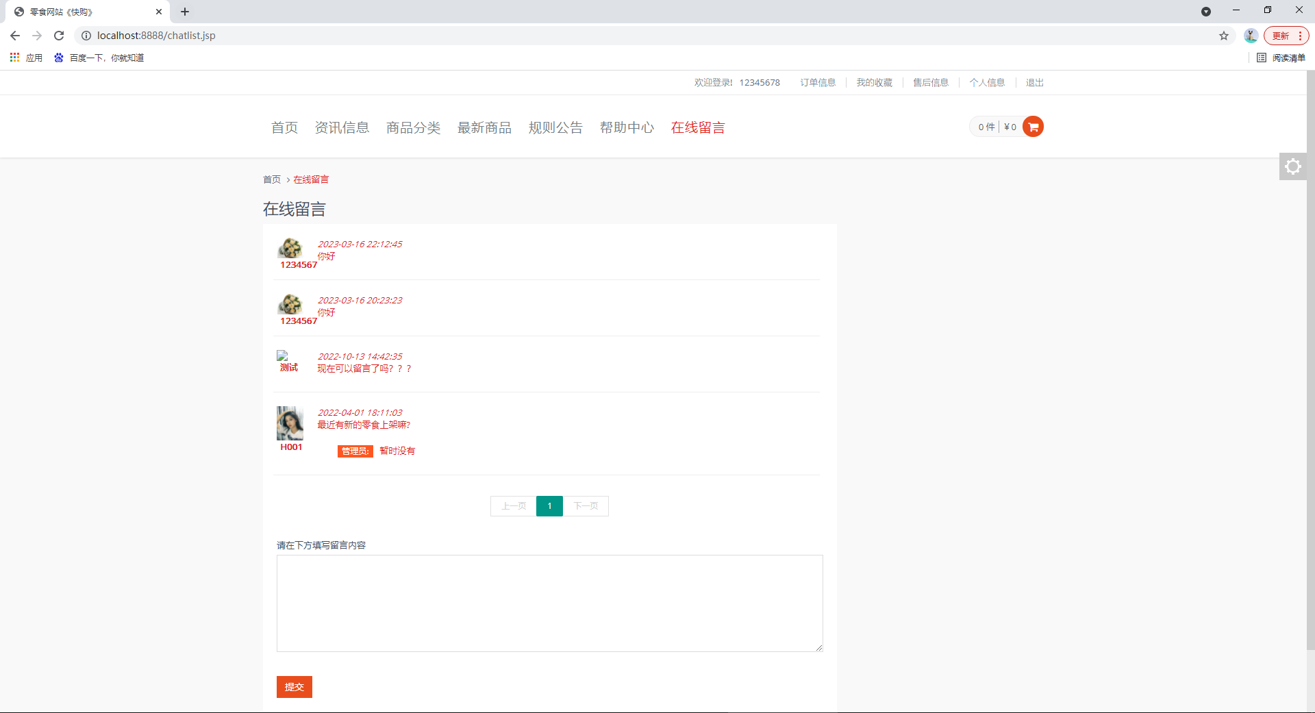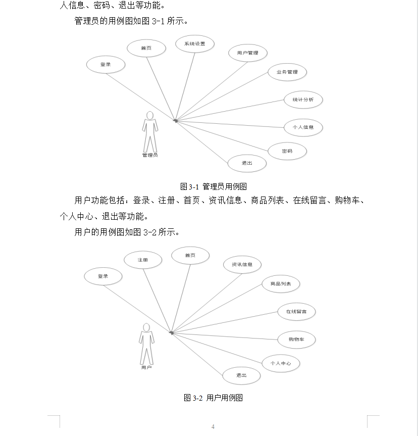 该系统可供管理员和用户使用,管理员功能包括:登录、首页、系统设置、用户管理、业务管理、统计分析、个人信息、密码、退出等功能。用户功能包括:登录、注册、首页、资讯信息、商品列表、在线留言、购物车、个人中心、退出等功能。