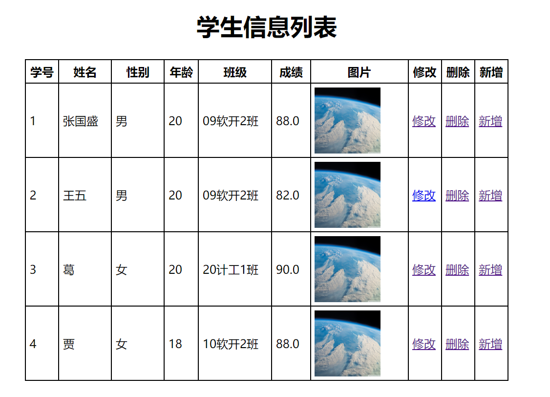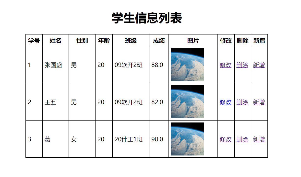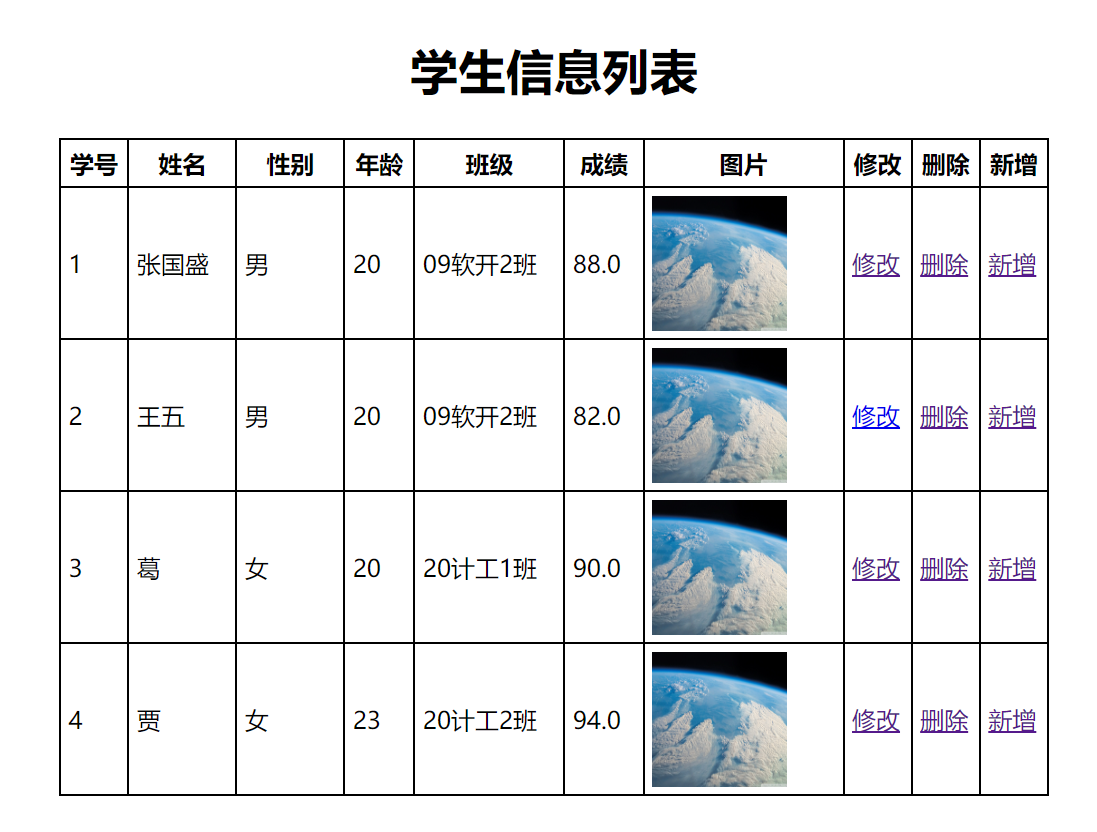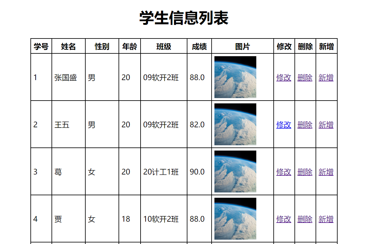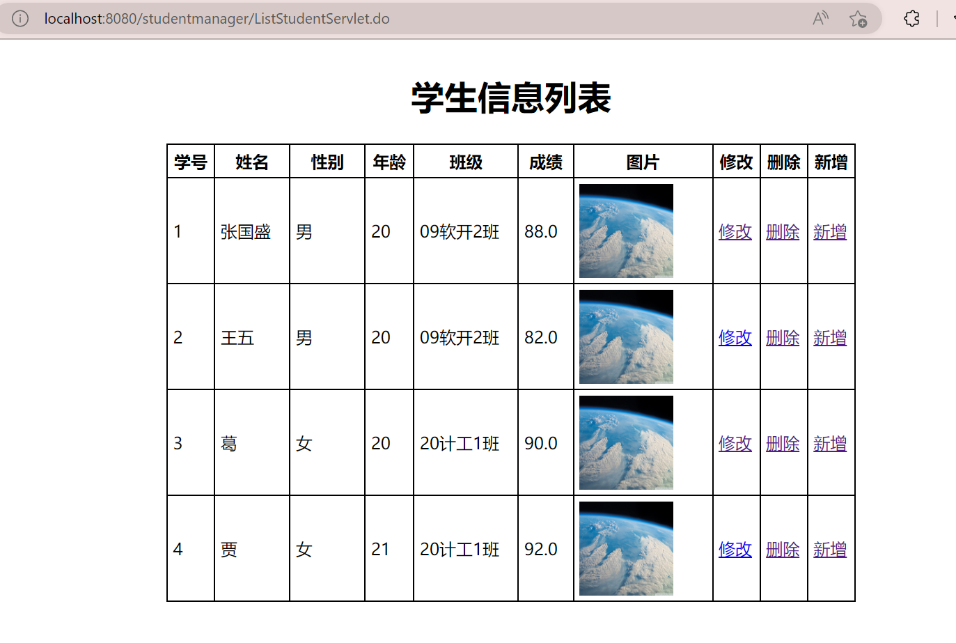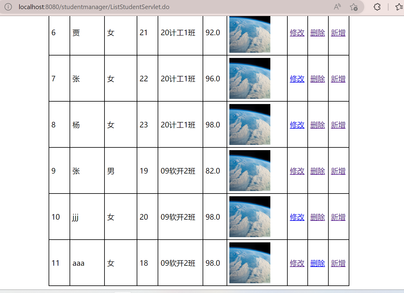 (9)将项目部署在Tomcat服务器,在浏览器输入:http://localhost:8080/studentmanager/ListStudentServlet.do,测试运行学生信息的增加、更新、删除、显示等操作。