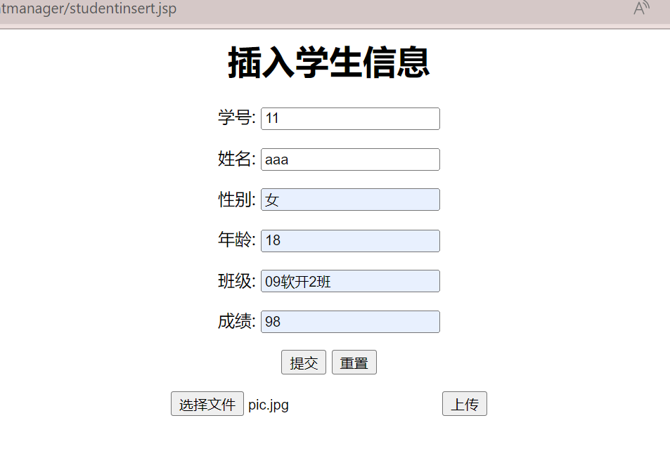 (2)在项目的WebRoot文件夹下创建一个upload文件夹用于存放用户上传的文件,增加学生信息字段:相片,根据相片字段的信息存储和维护完善案例软件,要求学生相片文件存放在服务器上项目的upload文件夹中,数据库中存放相片的文件名,显示相片时是根据文件名到该文件夹中访问图片文件而实现。