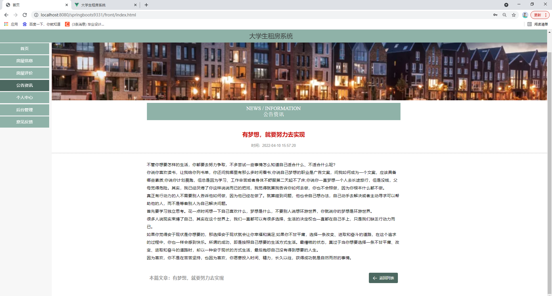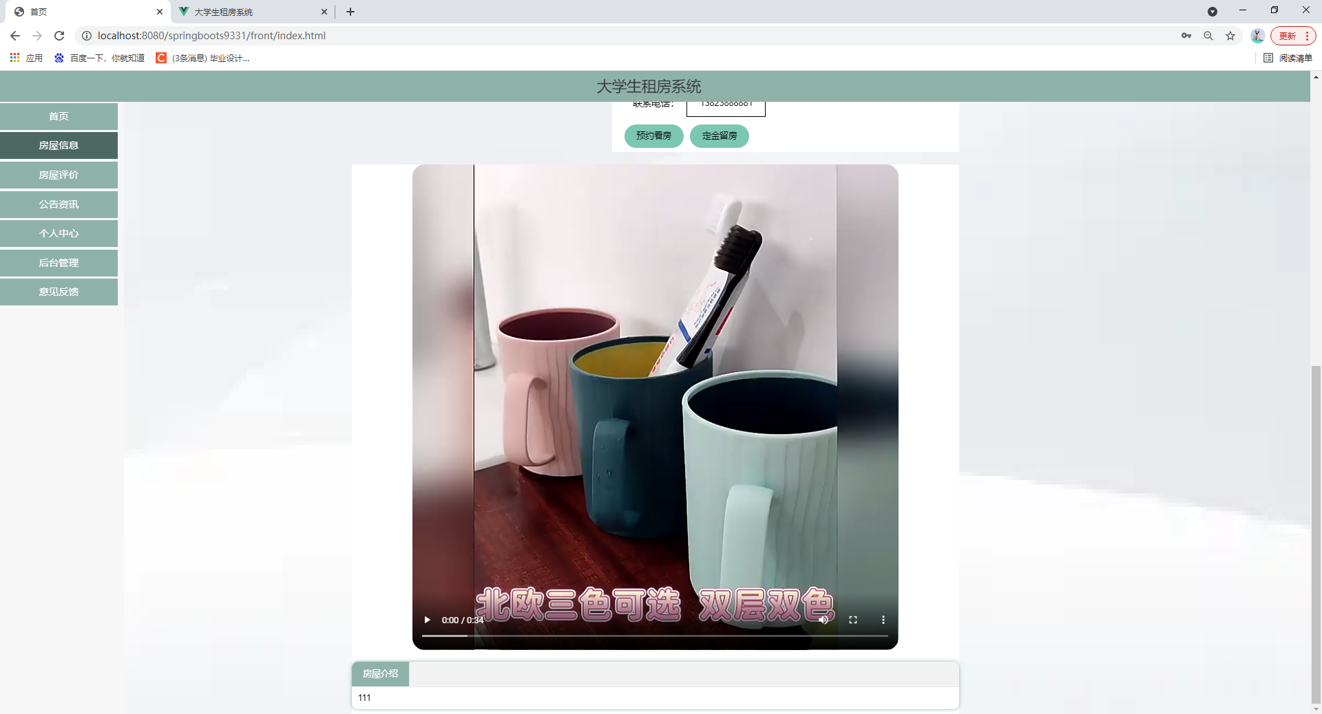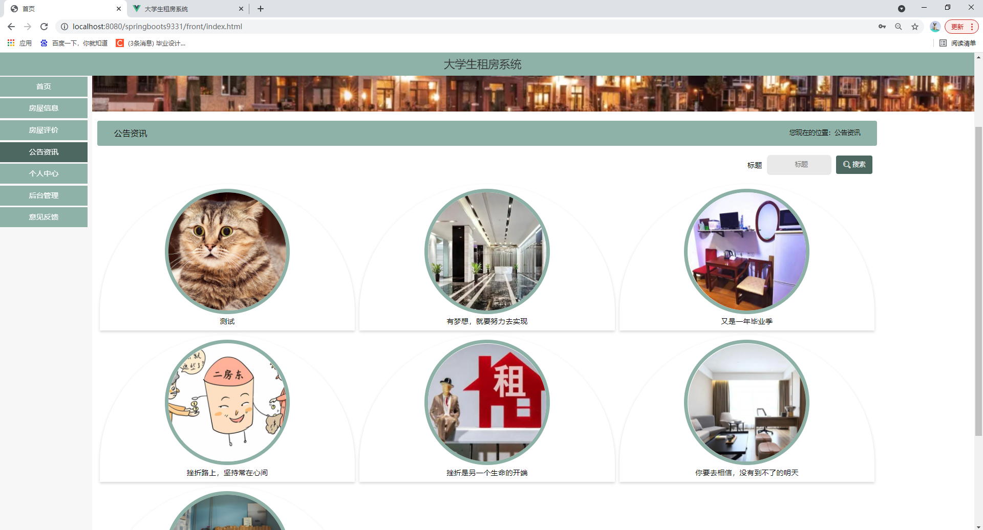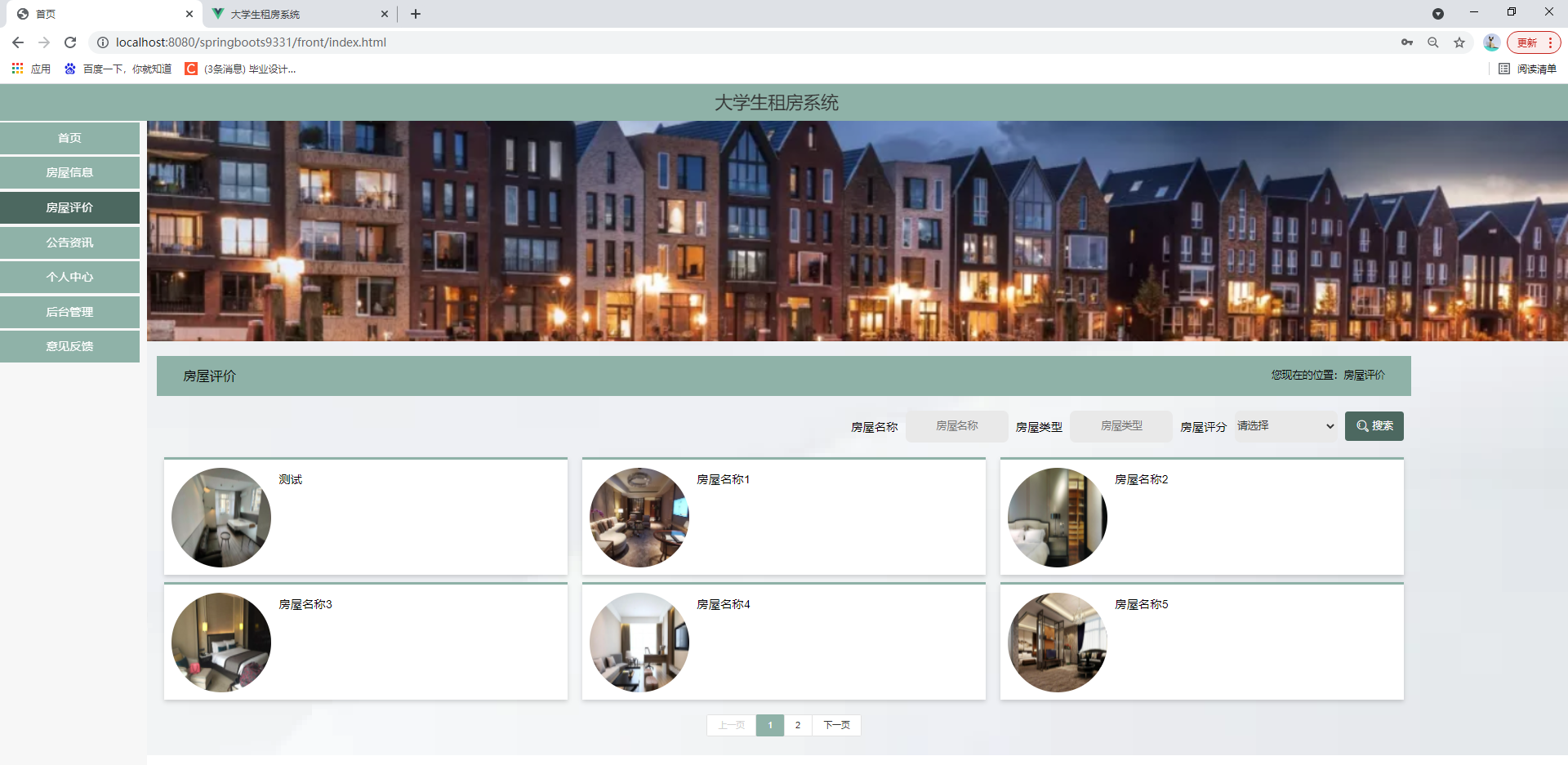 前台功能:进入系统可以实现首页,房屋信息,房屋评价,公告资讯,个人中心,后台管理,意见反馈等功能进行操作;