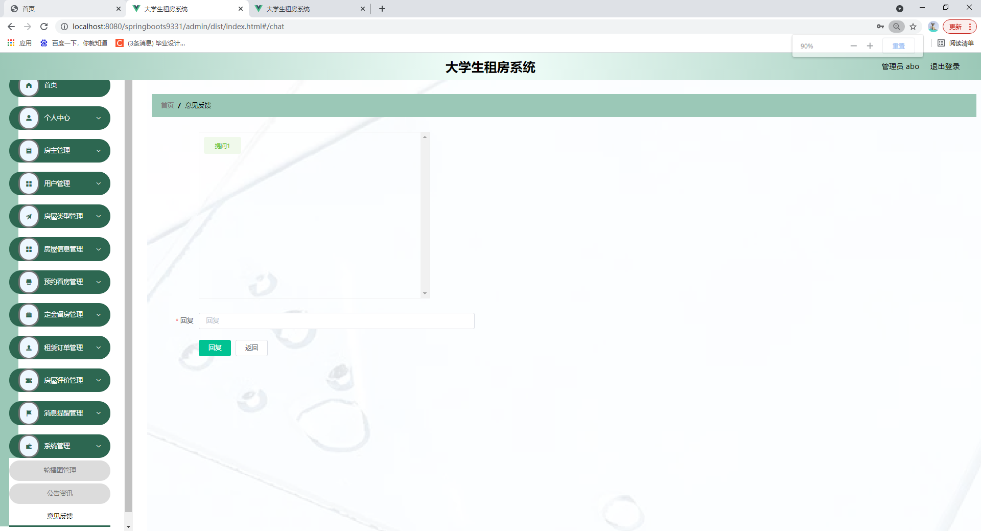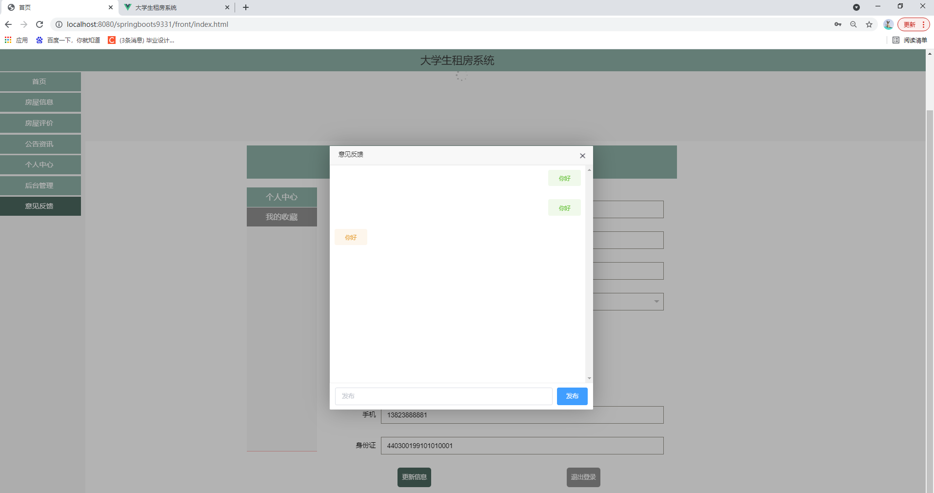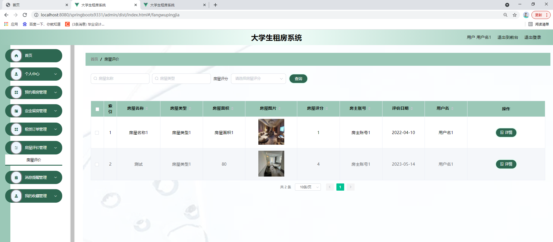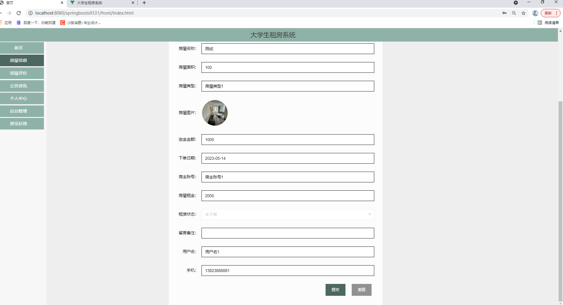 前台功能:进入系统可以实现首页,房屋信息,房屋评价,公告资讯,个人中心,后台管理,意见反馈等功能进行操作;