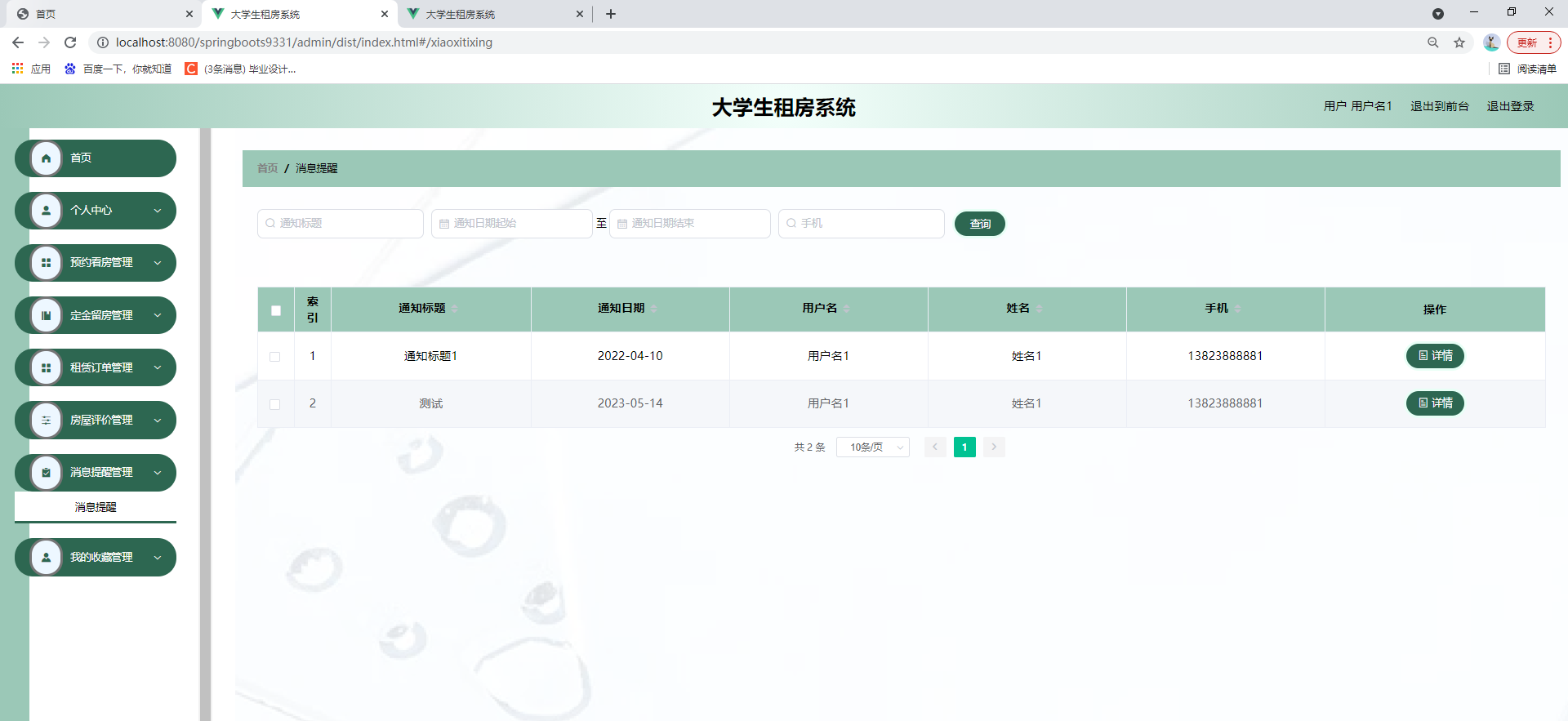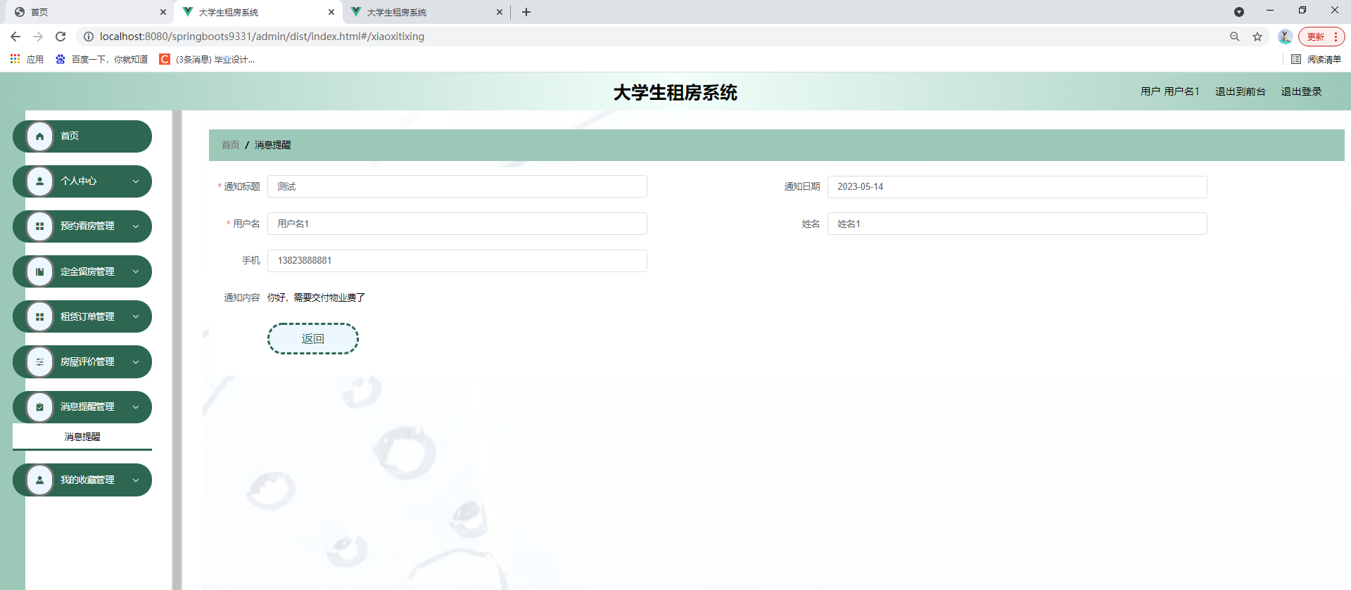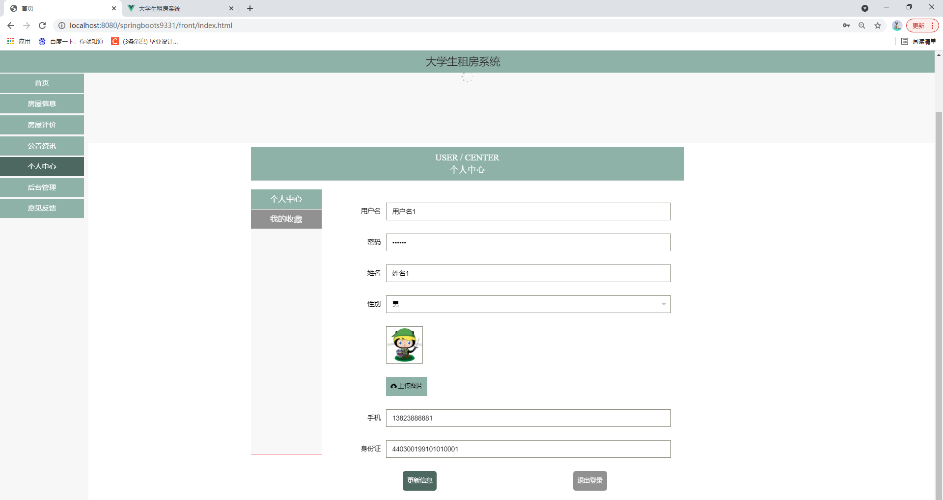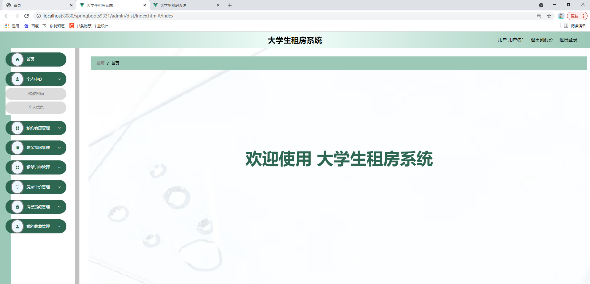 前台功能:进入系统可以实现首页,房屋信息,房屋评价,公告资讯,个人中心,后台管理,意见反馈等功能进行操作;