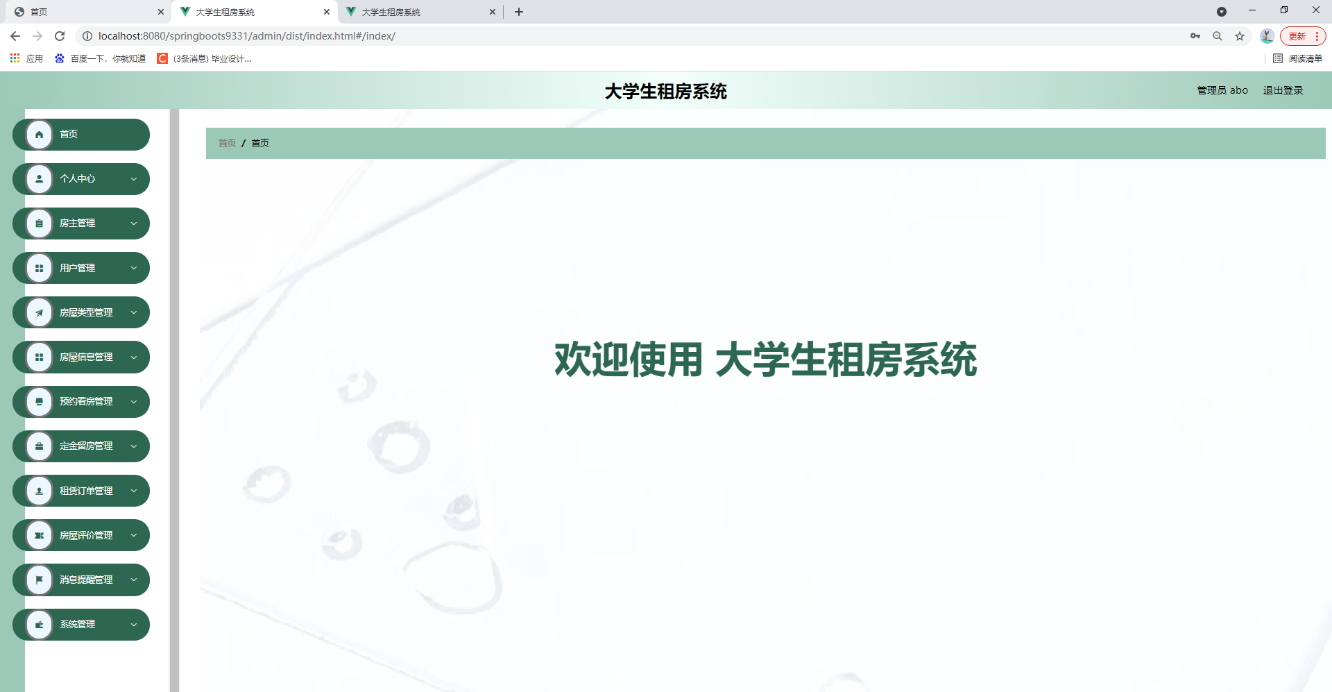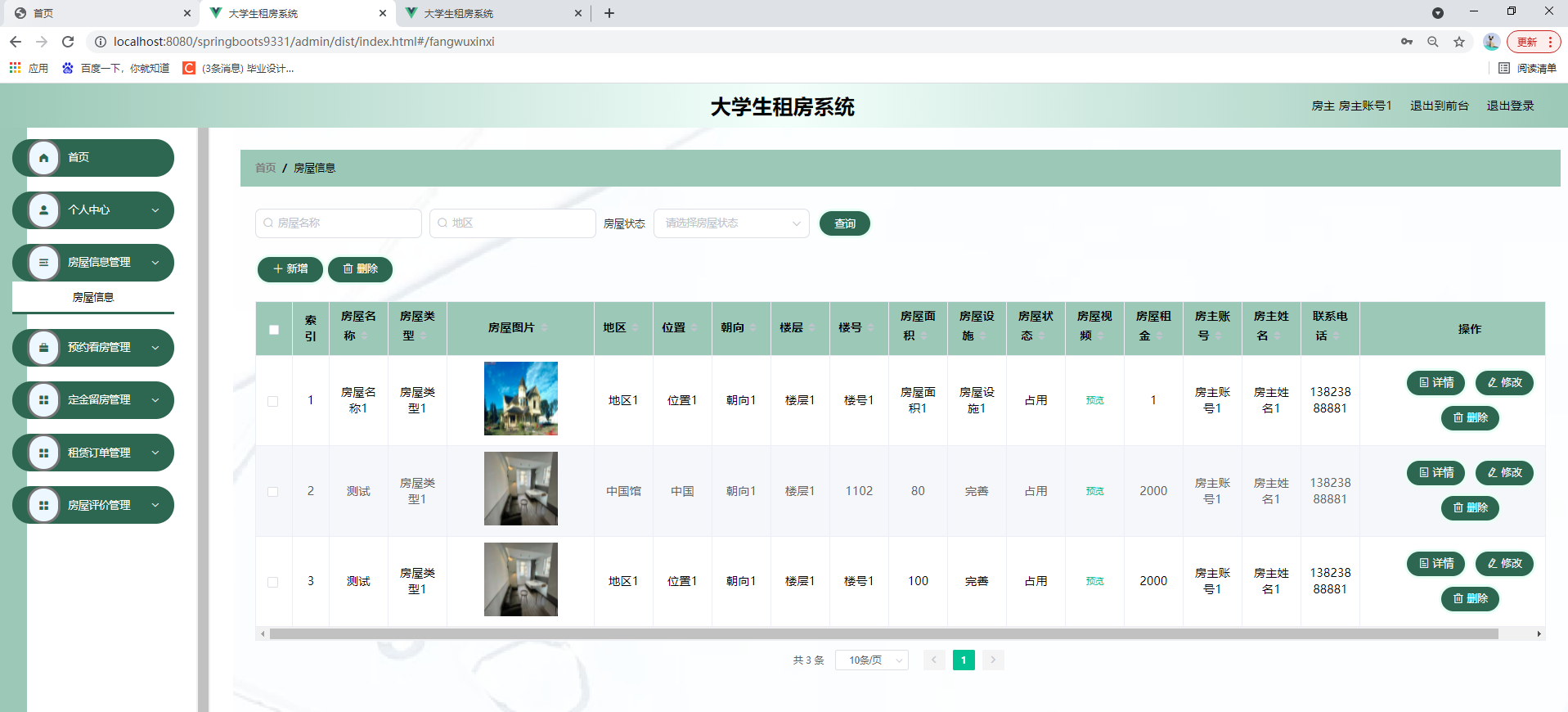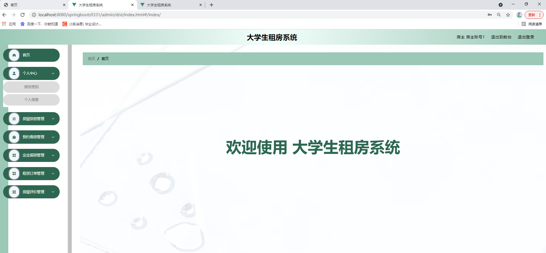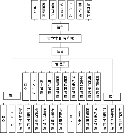 后台主要是管理员,房主和用户,主要功能包括首页,个人中心,房主管理,用户管理,房屋类型管理,房屋信息管理,预约看房管理,定金留房管理,租赁订单管理,房屋评价管理等。