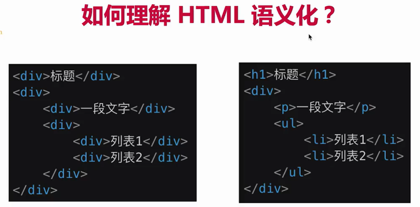 上图右边这张图语义化:让人更容易读懂,让搜索引擎更容易读懂(SEO)。