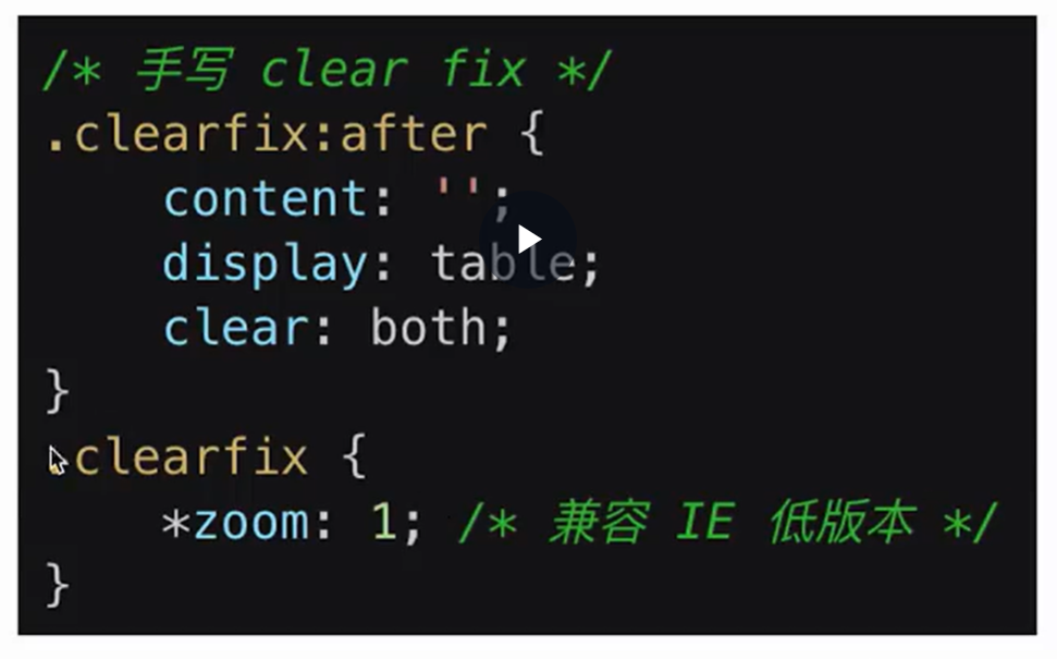 clearfix通过强制让父元素识别包含的浮动子元素,从而避免父元素的高度塌陷。其背后的原理是通过 CSS 的 伪元素(after) 生成一个看不见的块元素,并清除浮动,使父元素能够包裹住子元素。