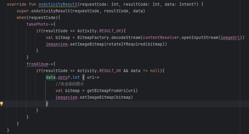 先要有一个outputImage, 新建一个,用于存储拍的照片。再取到这个uri, 再intent, android.media.action.IMAGE_CAPTURE,putExtra到uri上。然后在OnActiveResult里when 一下,就找到返回 RESULT_OK,BitmapFactory.decodeStream取到 bitmap,显示出来。