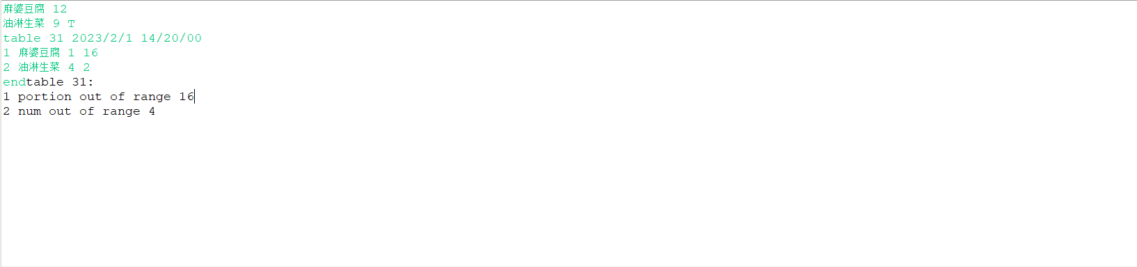 5、代点菜时,桌号不存在,输出"Table number :"+被点菜桌号+" does not exist";本次作业不考虑两桌记录时间不匹配的情况。