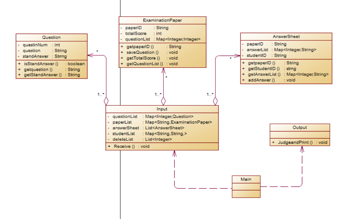 在上述类图中,分别有Question、ExaminationPaper、AnswerSheet、Input、Output以及测试类Main。其中题目类(用于封装单个题目的信息)、试卷类(用于封装整套题目的信息)、 答卷类(用于封装答题信息)、输入类(用于接收输入的信息)、输出类(用于处理接收的信息并判题给出结果)。