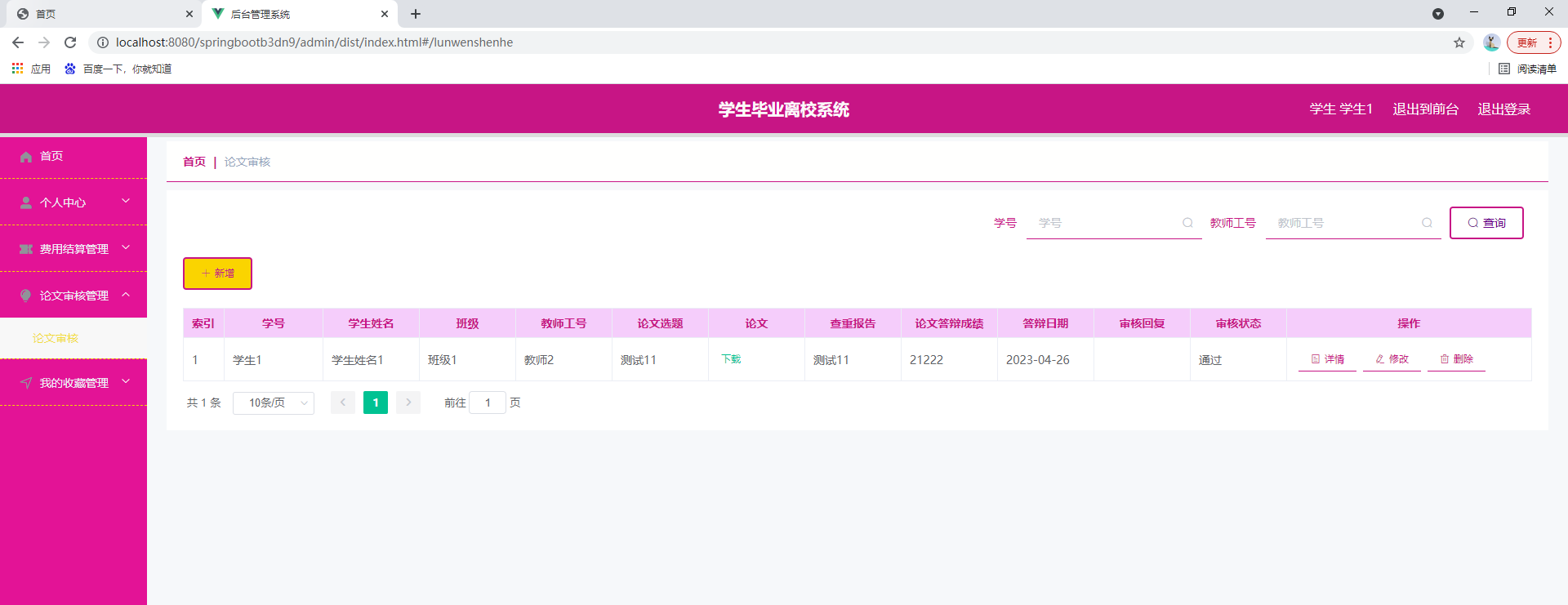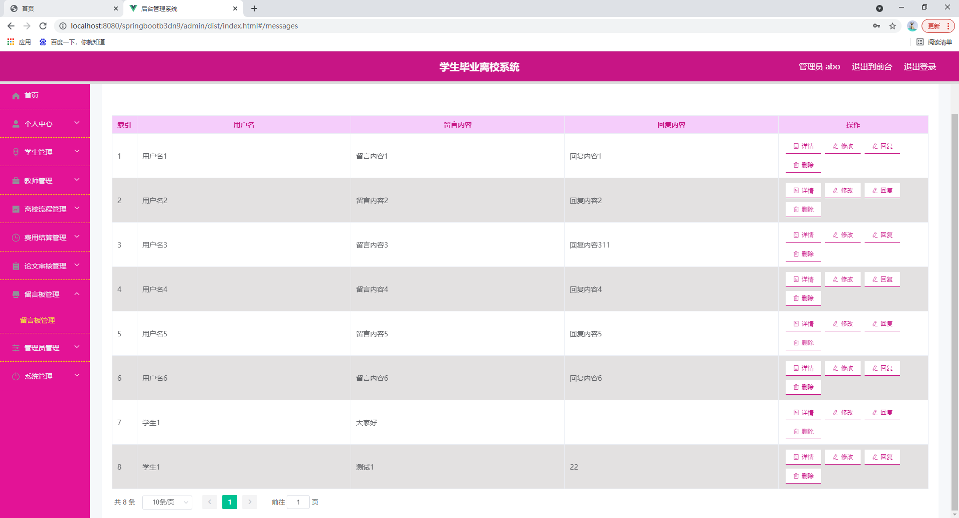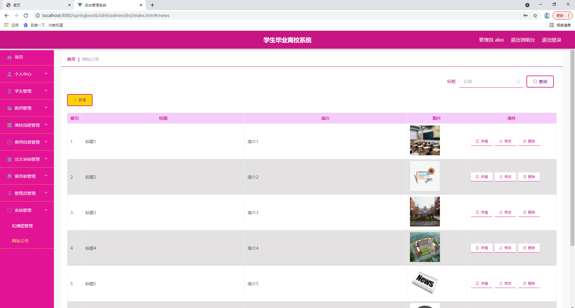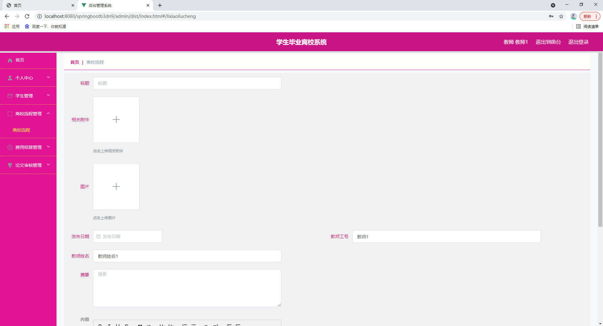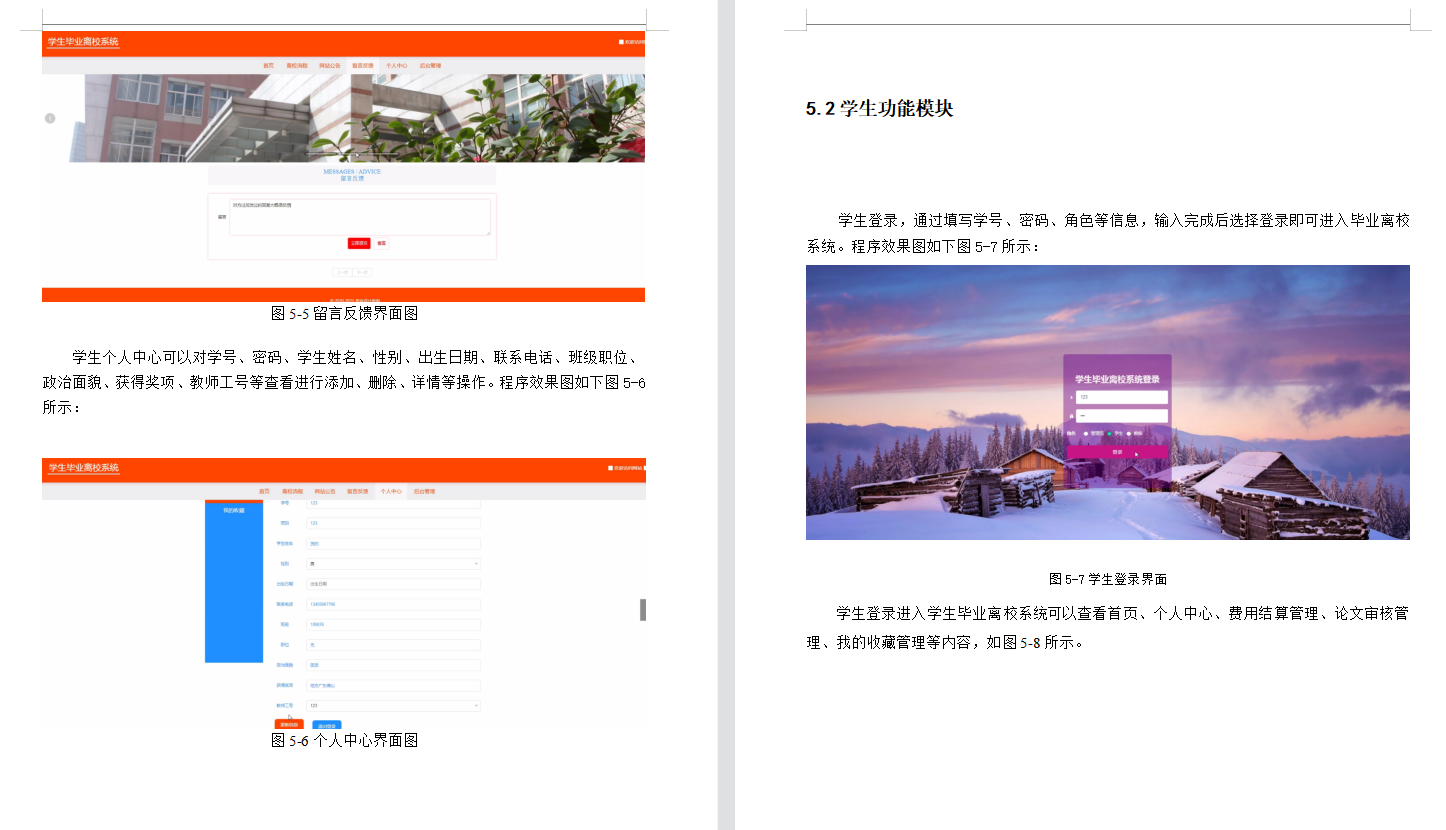 学生毕业离校系统的开发过程中,采用B / S架构,主要使用Java技术进行开发,结合最新流行的springboot框架。中间件服务器是Tomcat服务器,使用Mysql数据库。该学生毕业离校系统包括管理员、学生和教师。其主要功能包括管理员:首页、个人中心、学生管理、教师管理、离校信息管理、费用结算管理、论文审核管理、管理员管理、留言板管理、系统管理等,前台首页;首页、离校信息、网站公告、留言反馈、个人中心、后台管理等,学生:首页、个人中心、费用结算管理、论文审核管理、我的收藏管理、等,教师:首页、个人中心、学生管理、离校信息管理、费用结算管理、论文审核管理等功能。