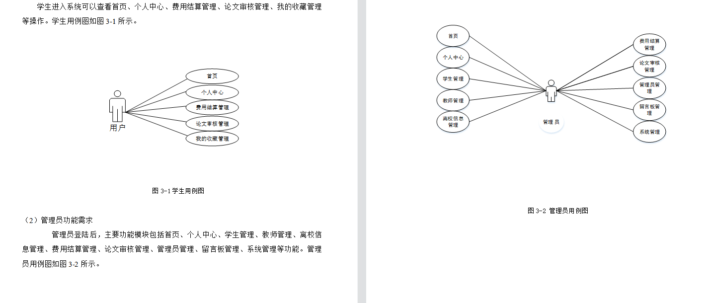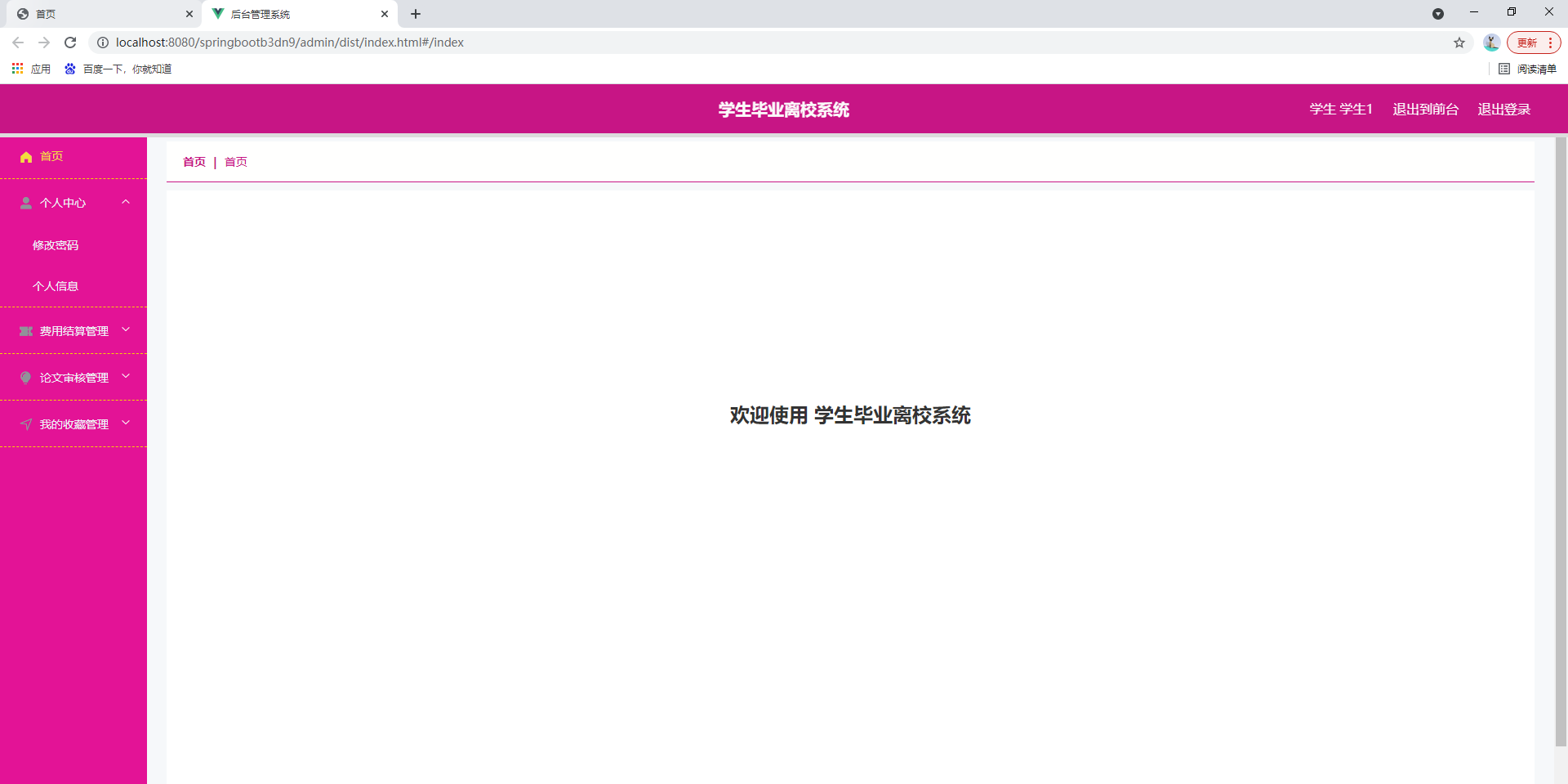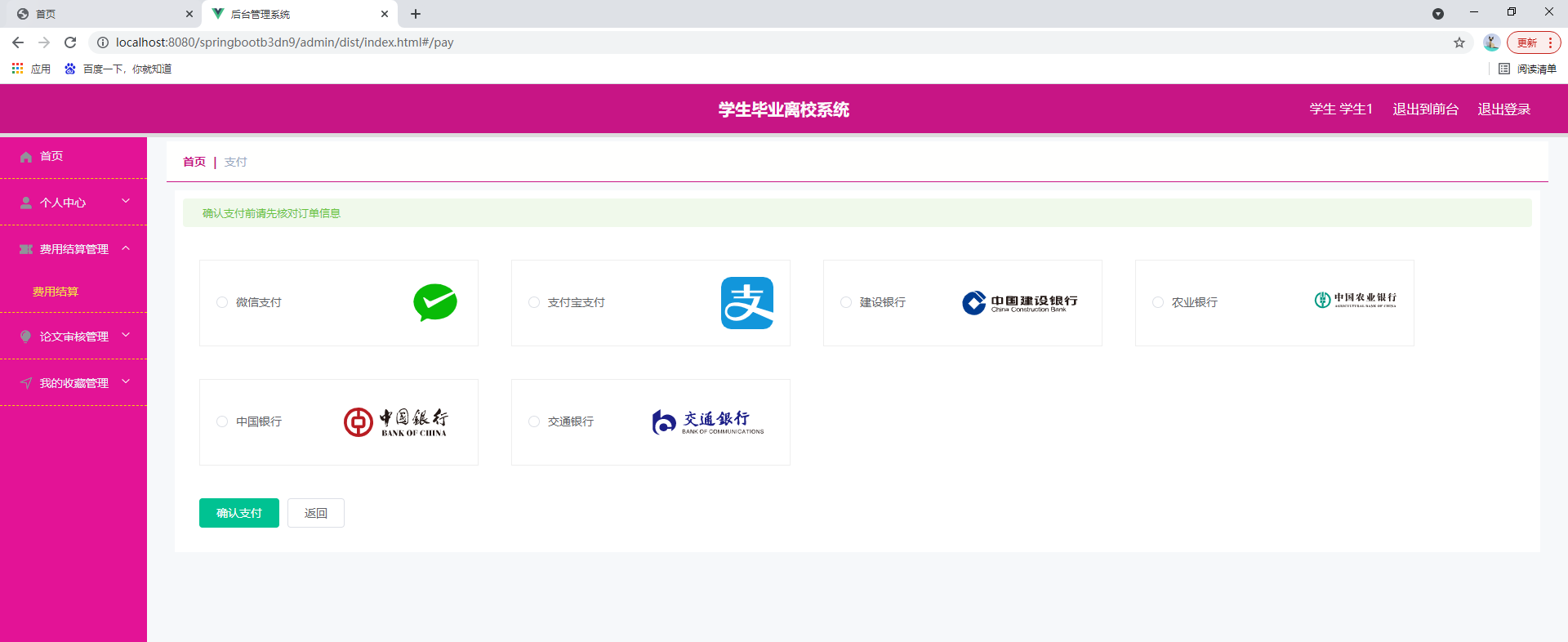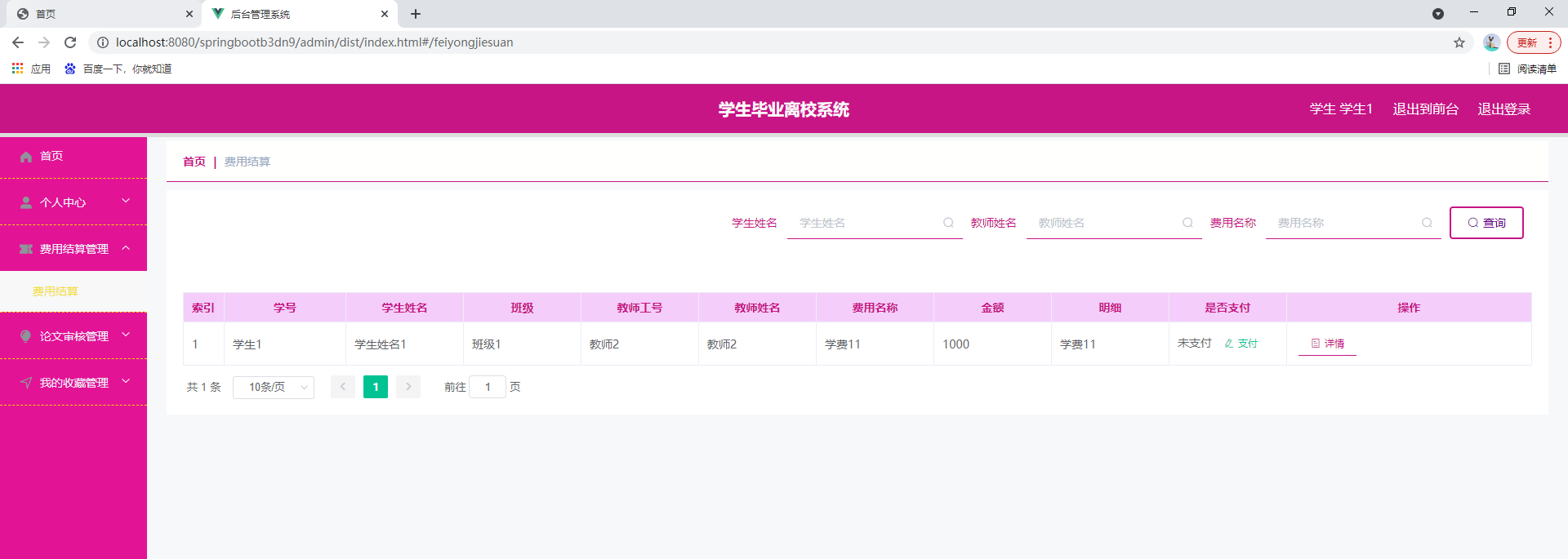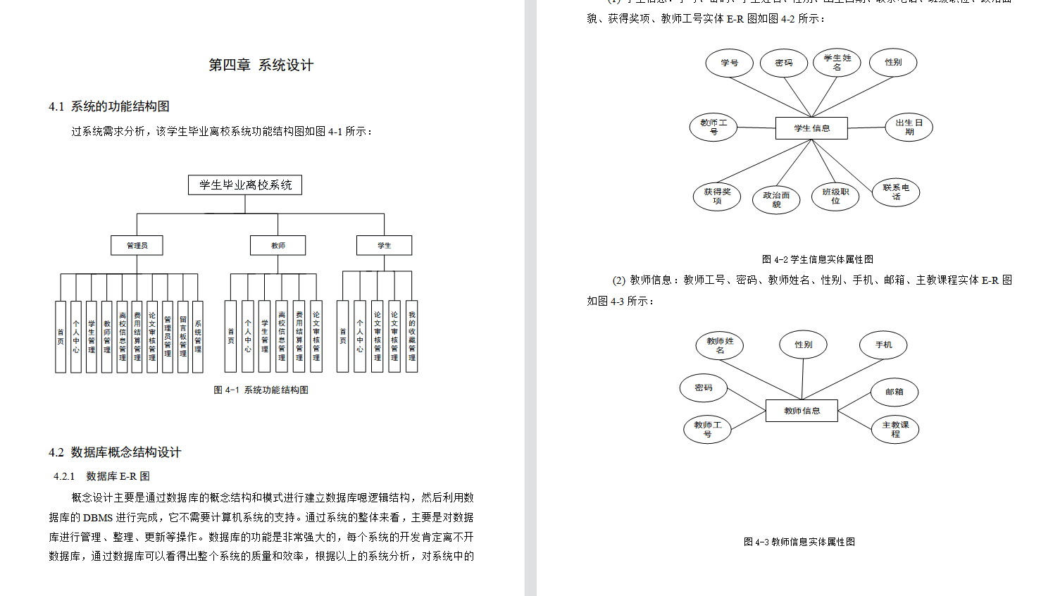 学生毕业离校系统的开发过程中,采用B / S架构,主要使用Java技术进行开发,结合最新流行的springboot框架。中间件服务器是Tomcat服务器,使用Mysql数据库。该学生毕业离校系统包括管理员、学生和教师。其主要功能包括管理员:首页、个人中心、学生管理、教师管理、离校信息管理、费用结算管理、论文审核管理、管理员管理、留言板管理、系统管理等,前台首页;首页、离校信息、网站公告、留言反馈、个人中心、后台管理等,学生:首页、个人中心、费用结算管理、论文审核管理、我的收藏管理、等,教师:首页、个人中心、学生管理、离校信息管理、费用结算管理、论文审核管理等功能。