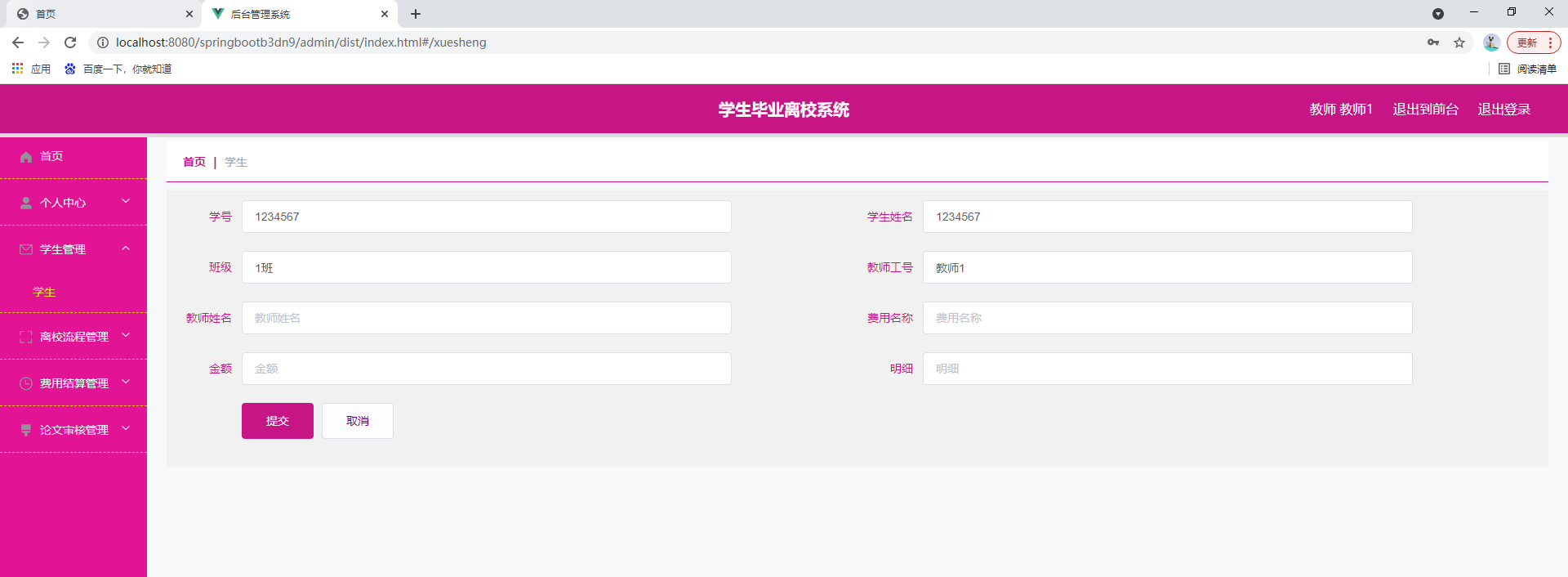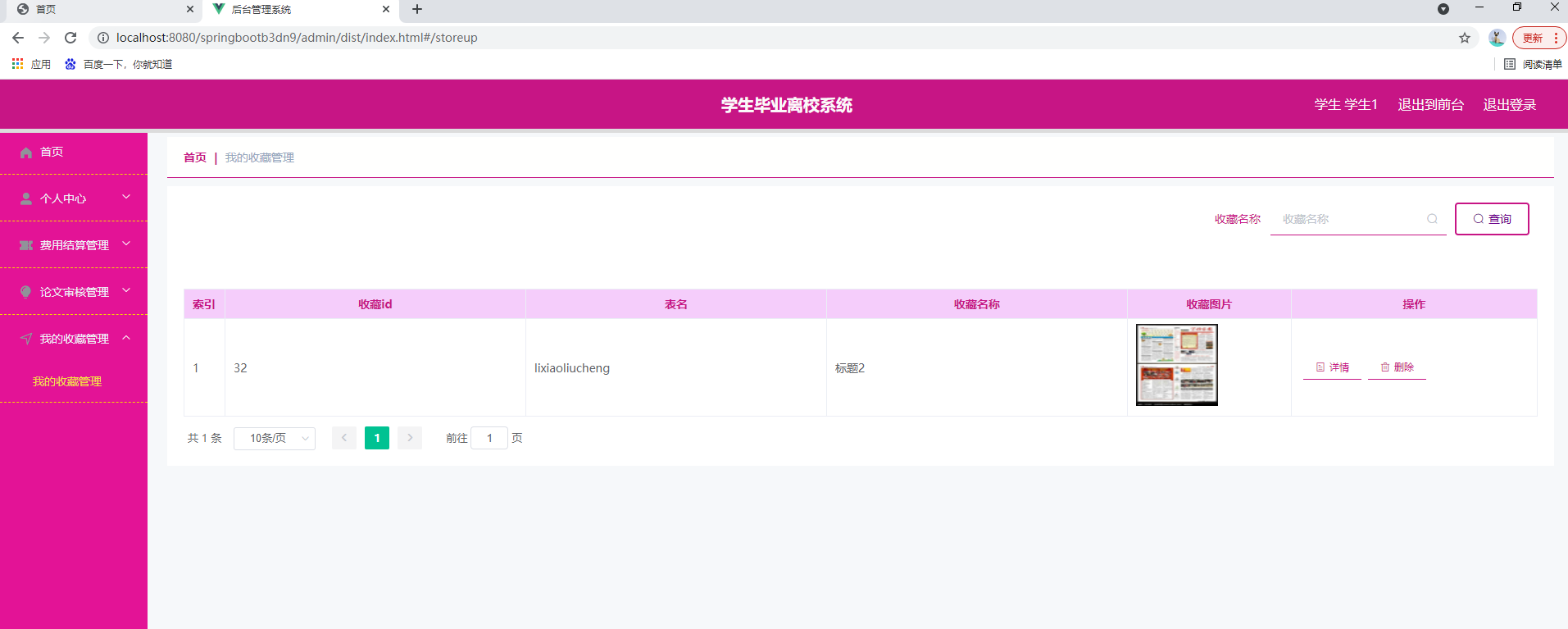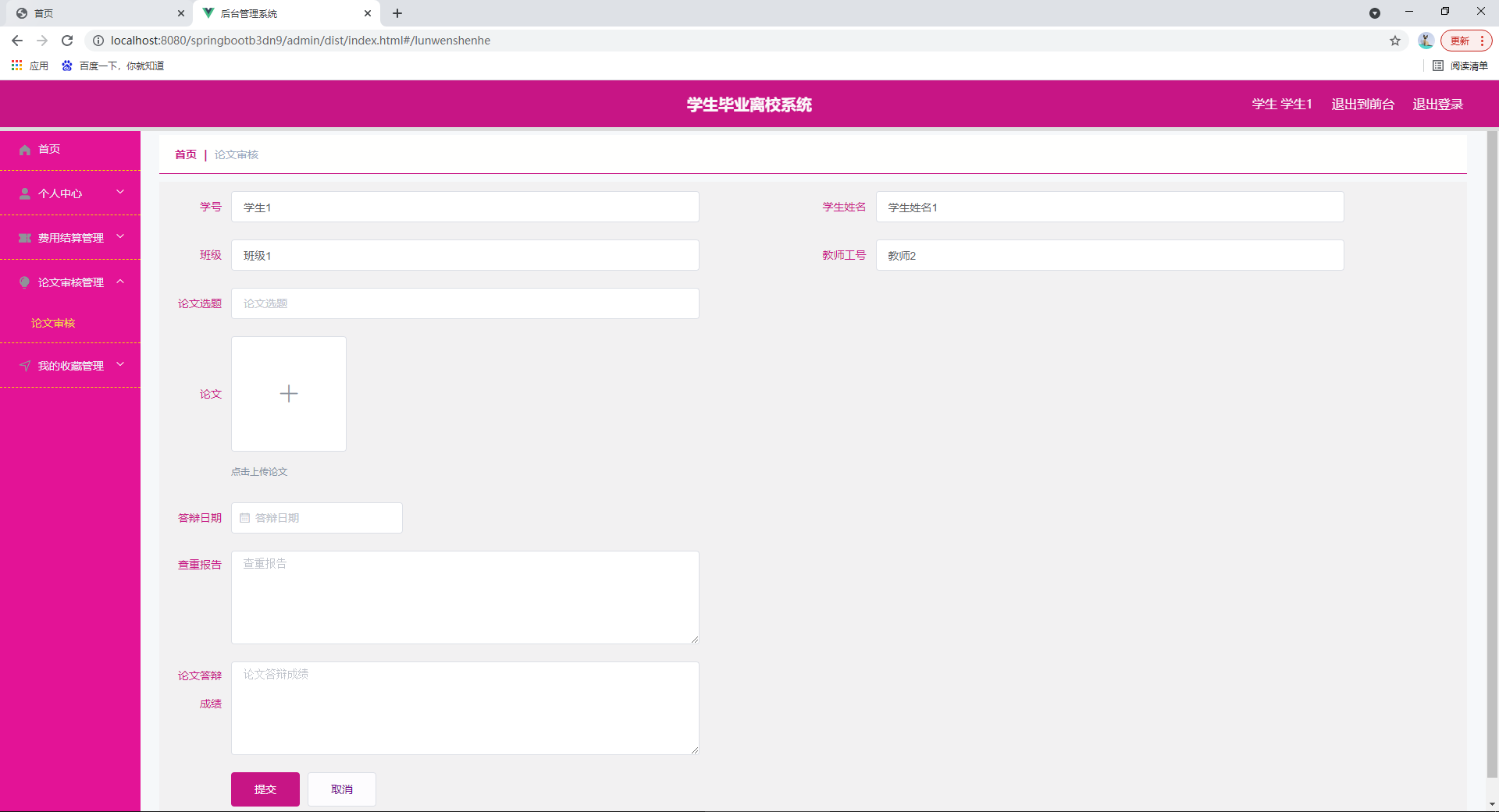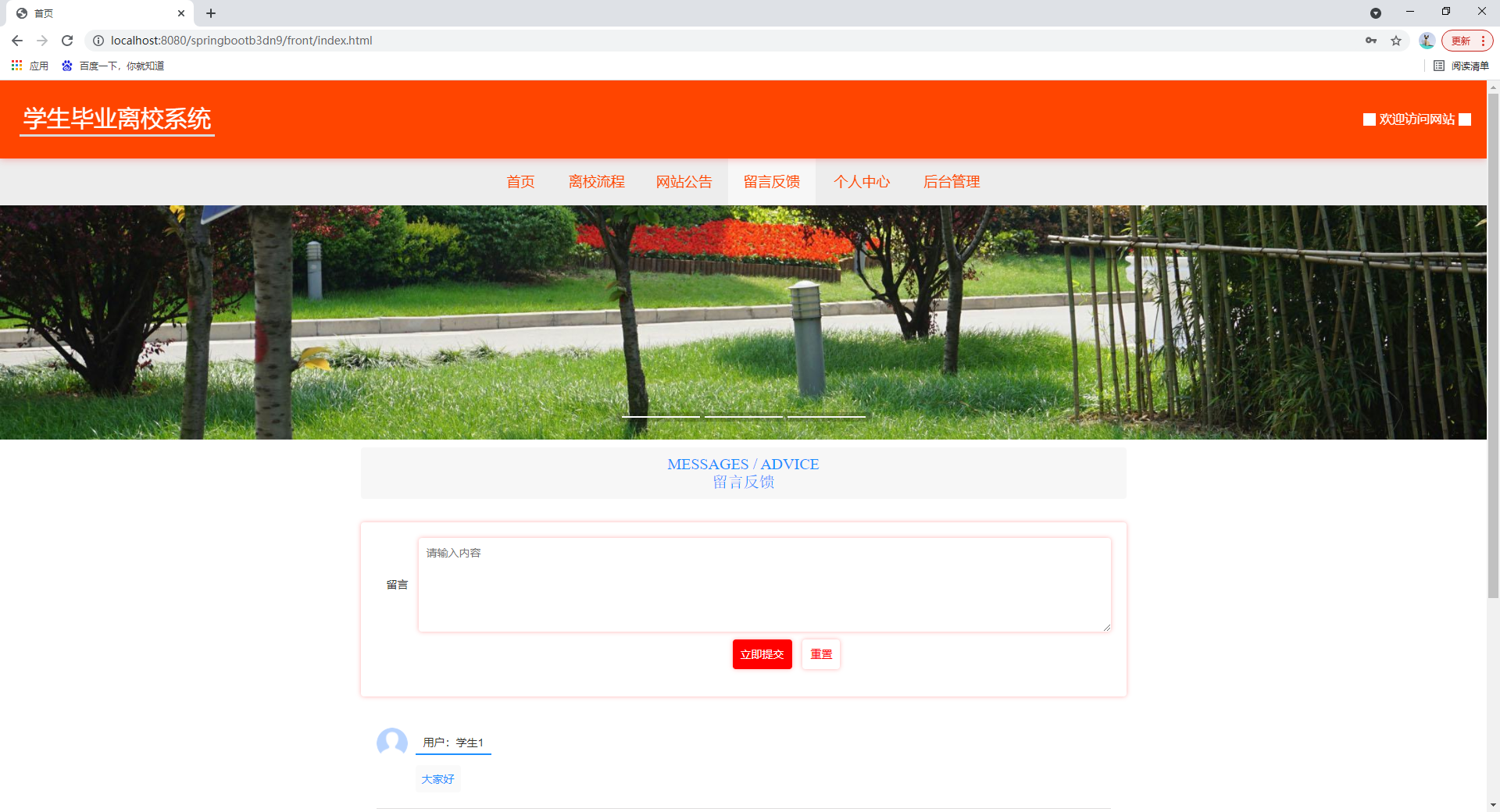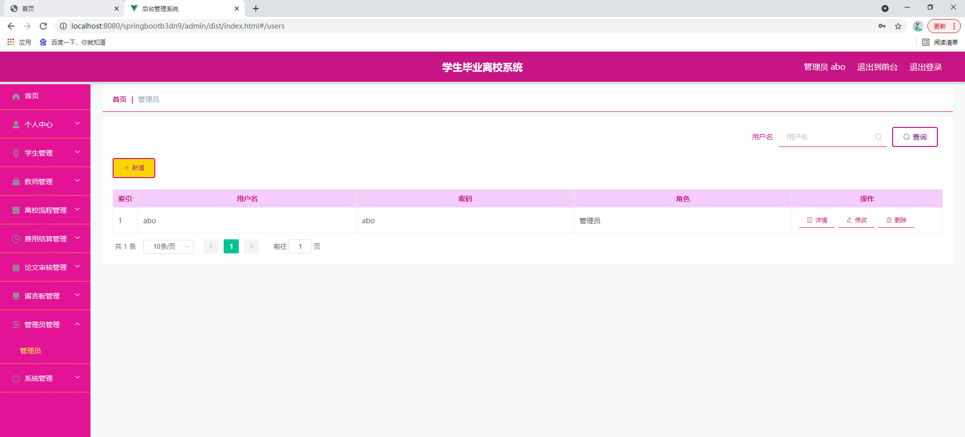 学生毕业离校系统的开发过程中,采用B / S架构,主要使用Java技术进行开发,结合最新流行的springboot框架。中间件服务器是Tomcat服务器,使用Mysql数据库。该学生毕业离校系统包括管理员、学生和教师。其主要功能包括管理员:首页、个人中心、学生管理、教师管理、离校信息管理、费用结算管理、论文审核管理、管理员管理、留言板管理、系统管理等,前台首页;首页、离校信息、网站公告、留言反馈、个人中心、后台管理等,学生:首页、个人中心、费用结算管理、论文审核管理、我的收藏管理、等,教师:首页、个人中心、学生管理、离校信息管理、费用结算管理、论文审核管理等功能。