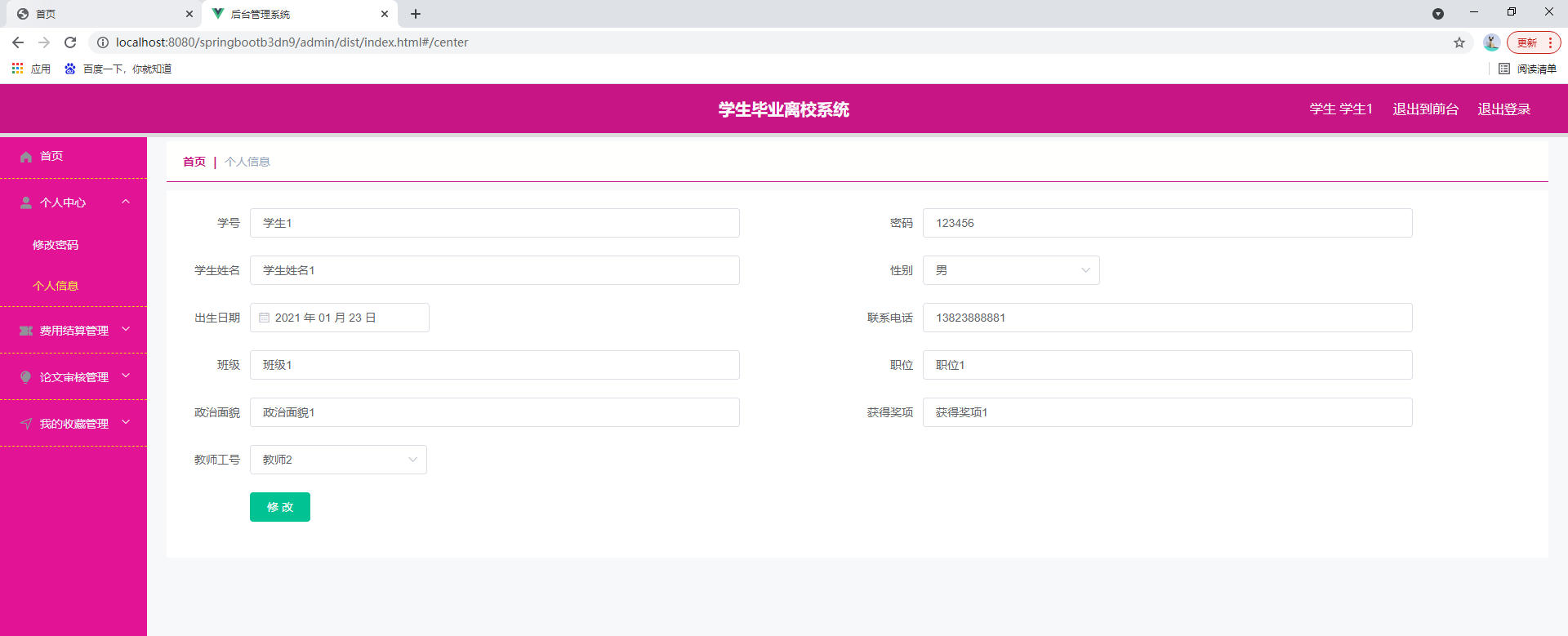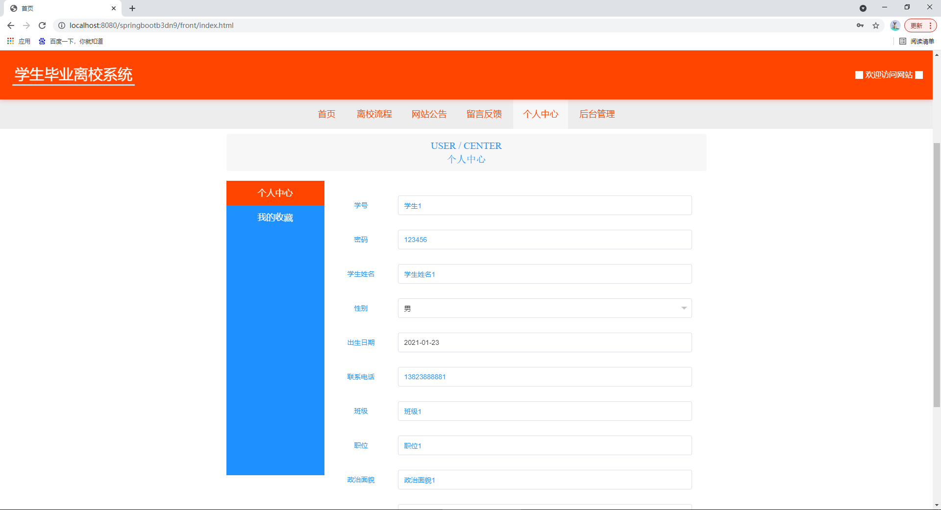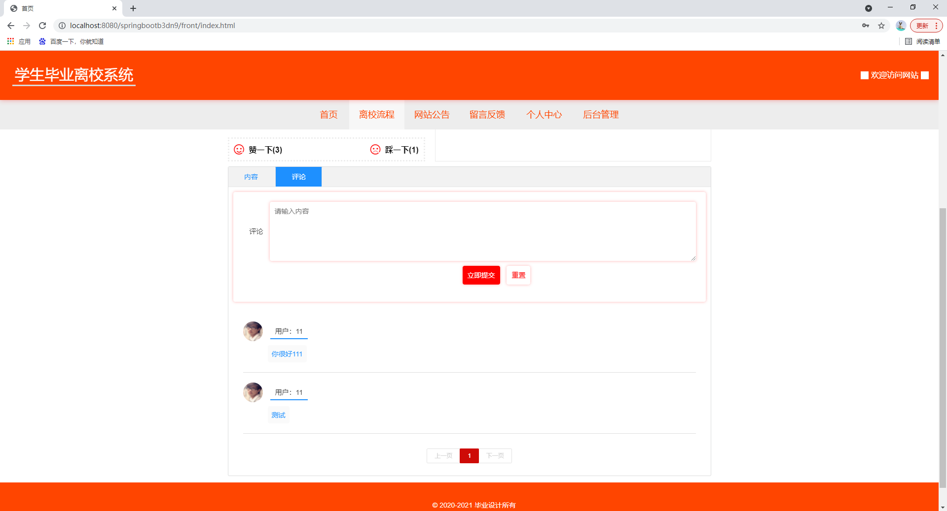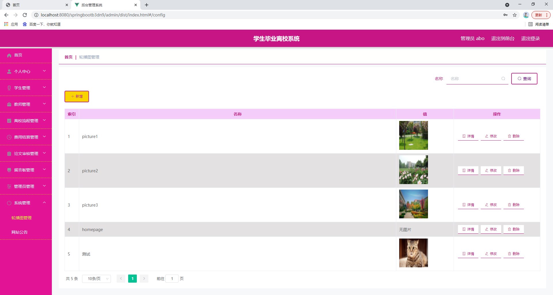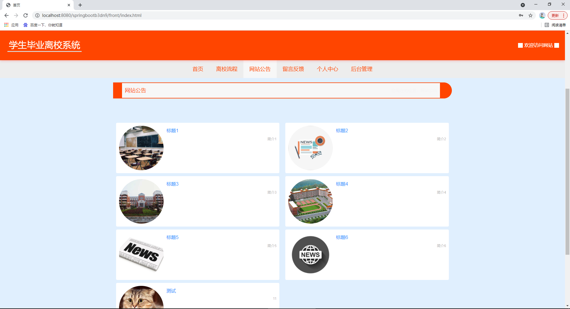 学生毕业离校系统的开发过程中,采用B / S架构,主要使用Java技术进行开发,结合最新流行的springboot框架。中间件服务器是Tomcat服务器,使用Mysql数据库。该学生毕业离校系统包括管理员、学生和教师。其主要功能包括管理员:首页、个人中心、学生管理、教师管理、离校信息管理、费用结算管理、论文审核管理、管理员管理、留言板管理、系统管理等,前台首页;首页、离校信息、网站公告、留言反馈、个人中心、后台管理等,学生:首页、个人中心、费用结算管理、论文审核管理、我的收藏管理、等,教师:首页、个人中心、学生管理、离校信息管理、费用结算管理、论文审核管理等功能。