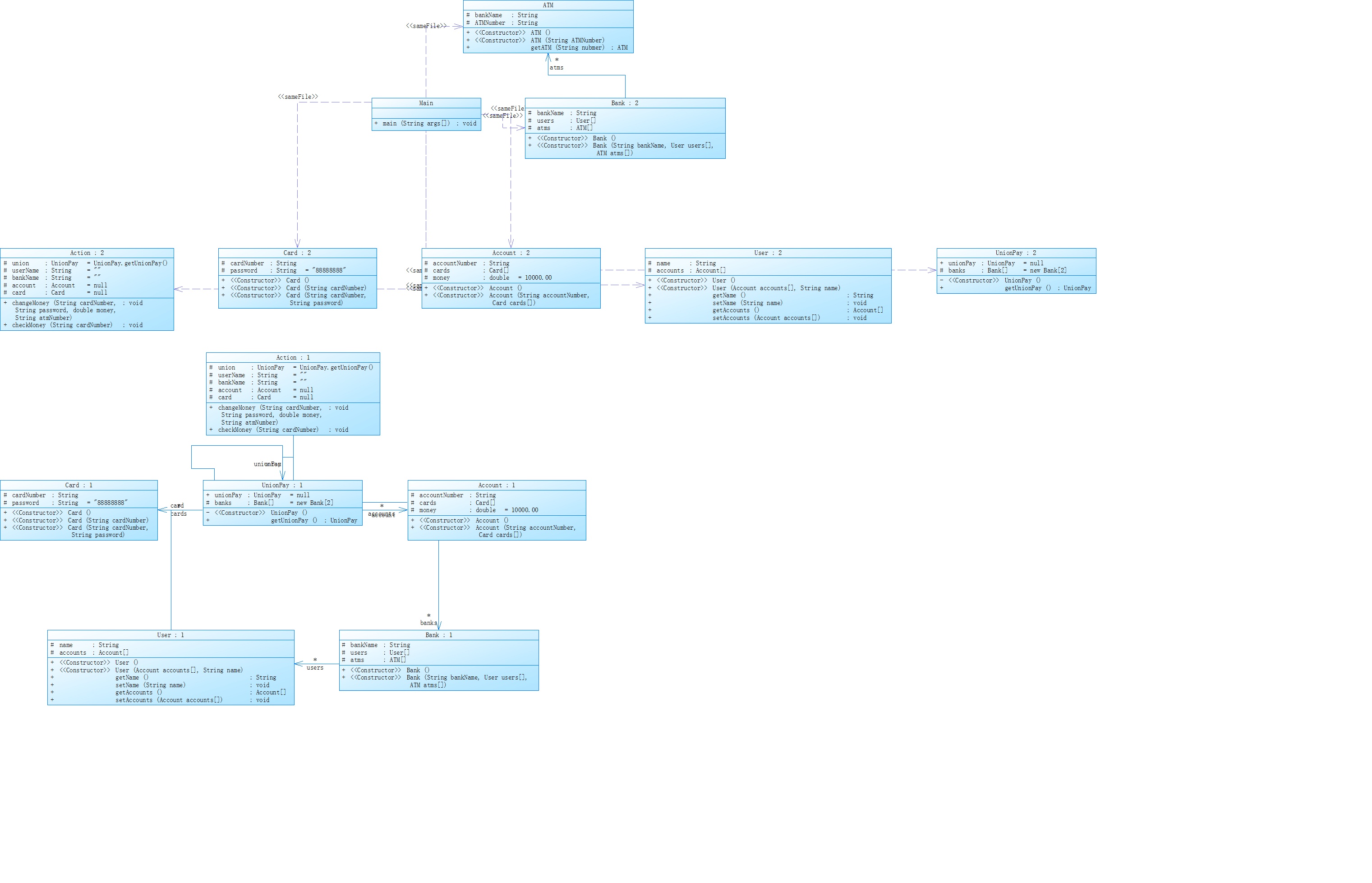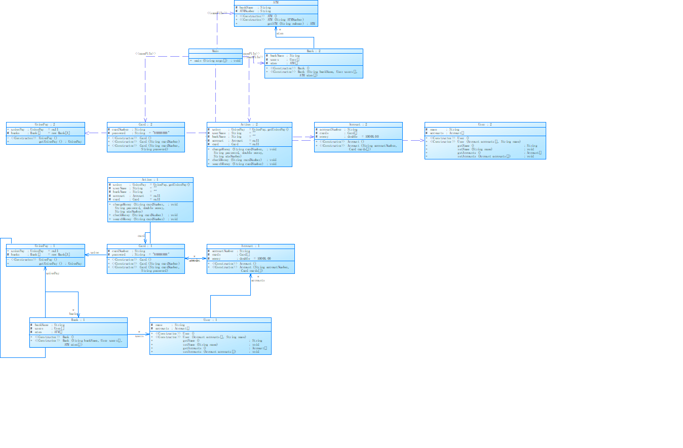 根据提示,我一共写了六个实体类,其中,UnionPay类会储存用户的各类信息,一边进行判断和更改,总体上,在实现信息读取和操作的时候,我选择了创造UnionPay对象并且用数组来实现不同的用户,不同账号,不同卡之间数据的读取与处理。在读取的时候我选择了用for(:)的语句来进行遍历,用这种方法可以保证所有信息全部读取到,并且逻辑性非常强,哪个地方出现错误可以很快地找出来。