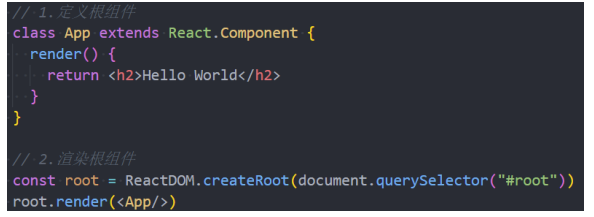 定义一个类(类名大写,组件的名称是必须大写的,小写会被认为是HTML元素),继承自React.Component 。2.实现当前组件的render函数 ✓ render当中返回的jsx内容,就是之后React会帮助我们渲染的内容